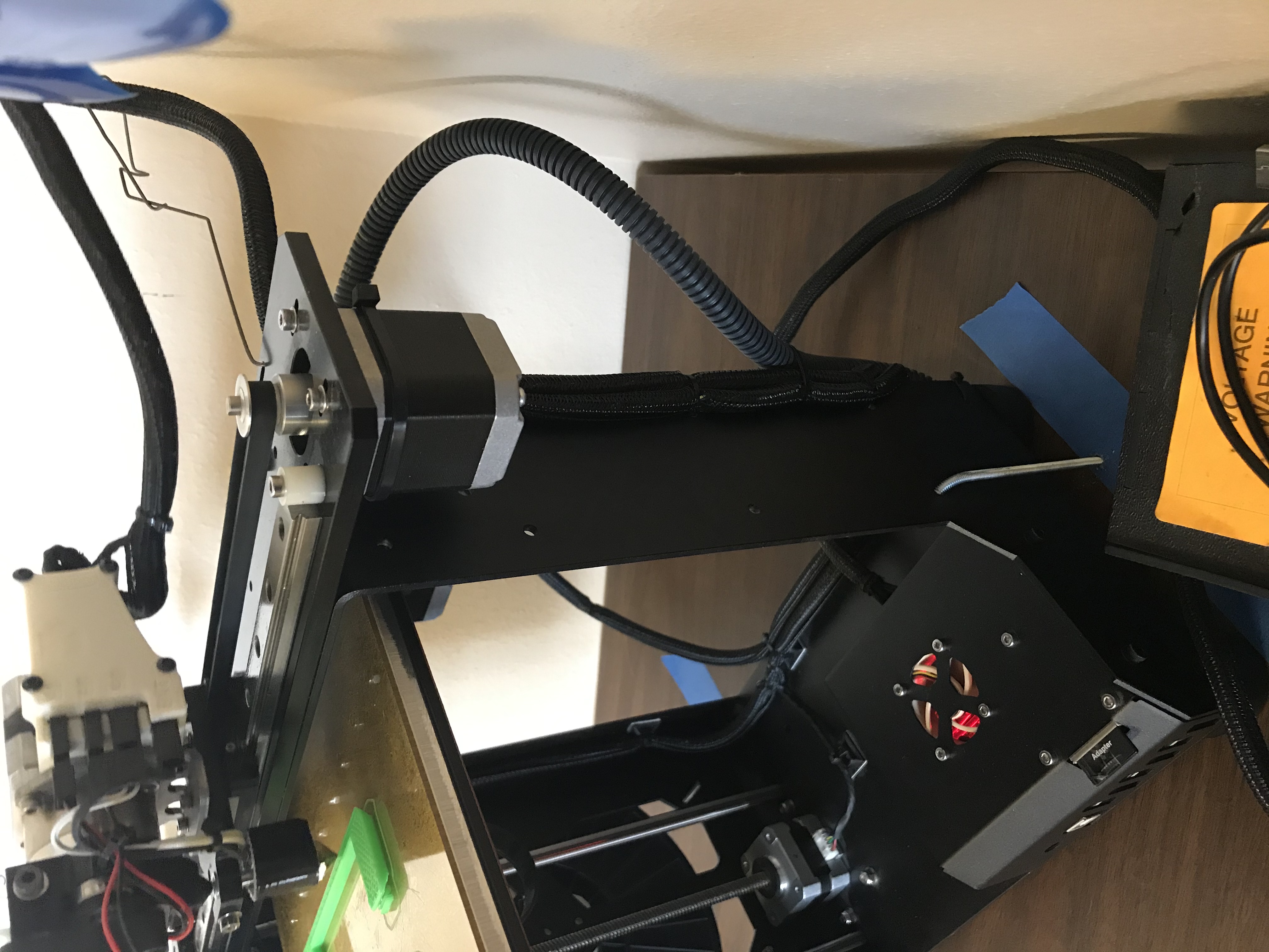 I have cheap 2nd hand tables for my maker space so it didn’t hurt me to lay painters tape under the edges of the M2 and use a sharpie to Mark the table next to the existing 4mm holes in the frame. Then a 5/32 drill bit (I sized up actually for a little extra clearance) cut thru the table top like butter, trying to keep the holes vertical. I cut the all thread into 6” lengths and bent 1/2” into a hook on one end with a vice and a hammer. Hook the hole in the M2 frame and slide the other end into table top, secure with washers and wing nut. Now I have 3point tie down and the force is applied straight down into the table thru the frame. It works great