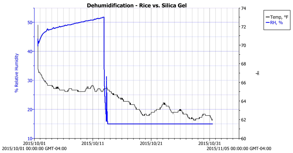 When I replaced the rice with a bag of silica gel, the humidity abruptly dropped below the data logger's 15% lower limit. The spike just after the drop shows where I opened the door to check the humidity indicator telltale.