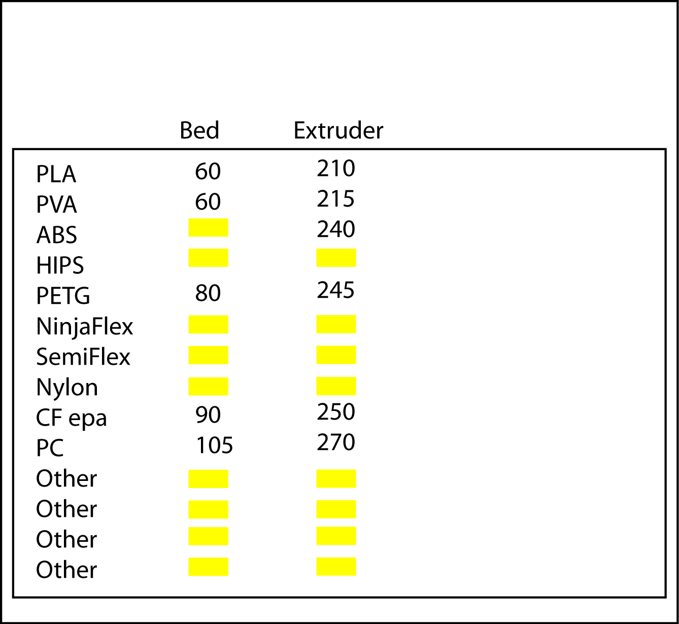 I'm putting together a chart with rough printing and bed temps on glass for each major type of filament. Most of the info has already been pulled from the filaments forum, insta's FTW thread, etc.