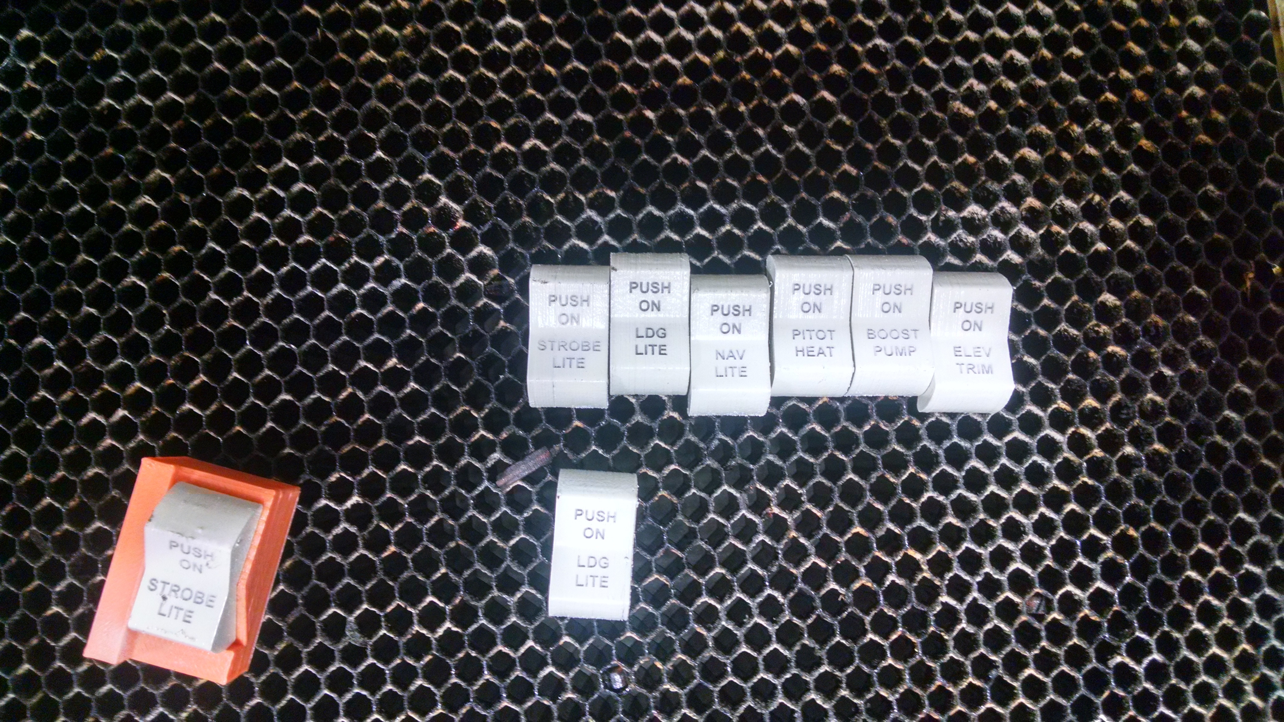 I have been trying to build aircraft switch covers for a while now. I found trying to print lettering just does not look good enough, however, a laser engraver does a great job. That still leaves the problem of contrasting color in the lettering. I made some that look great by painting a cover made from black nylon, then lasing off the paint. The paint does not hold up as well as I would like, though, so I came up with a new idea...