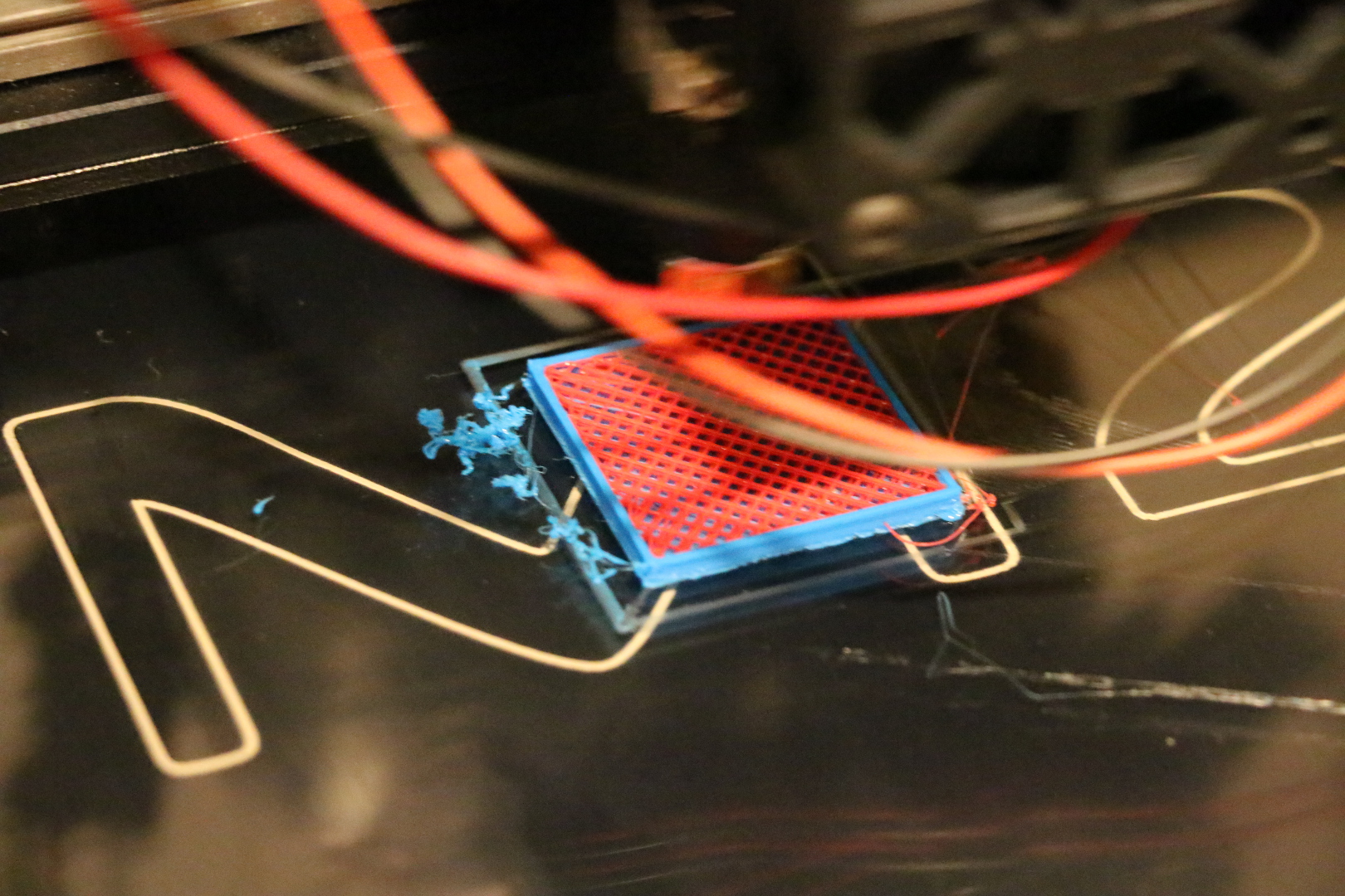 3. There was no wipe for color changes and since they had some plastic left in the nozzle it would leak out when the other extruder was being used. You can see the blue fuzz on the left from that. Didn't happen as much with the red because the middle layers used just a little blue compared to the red.