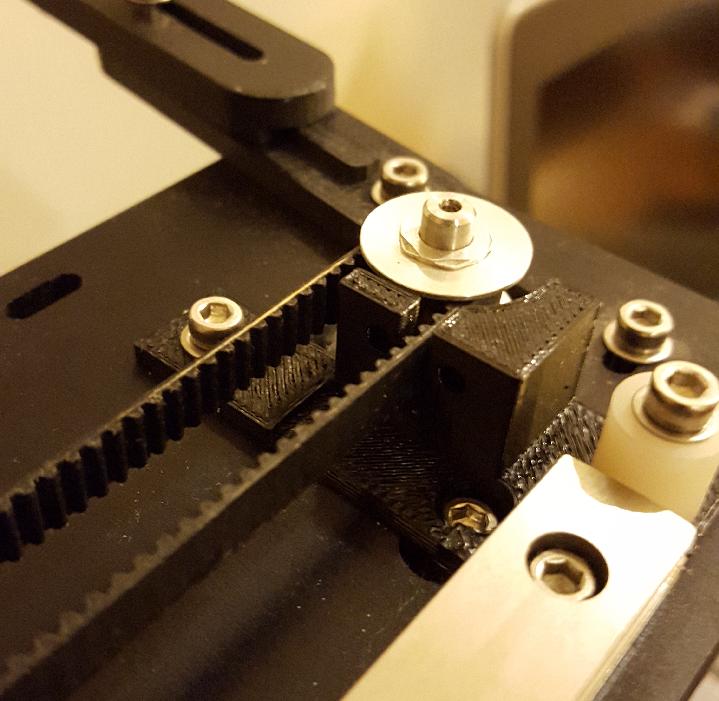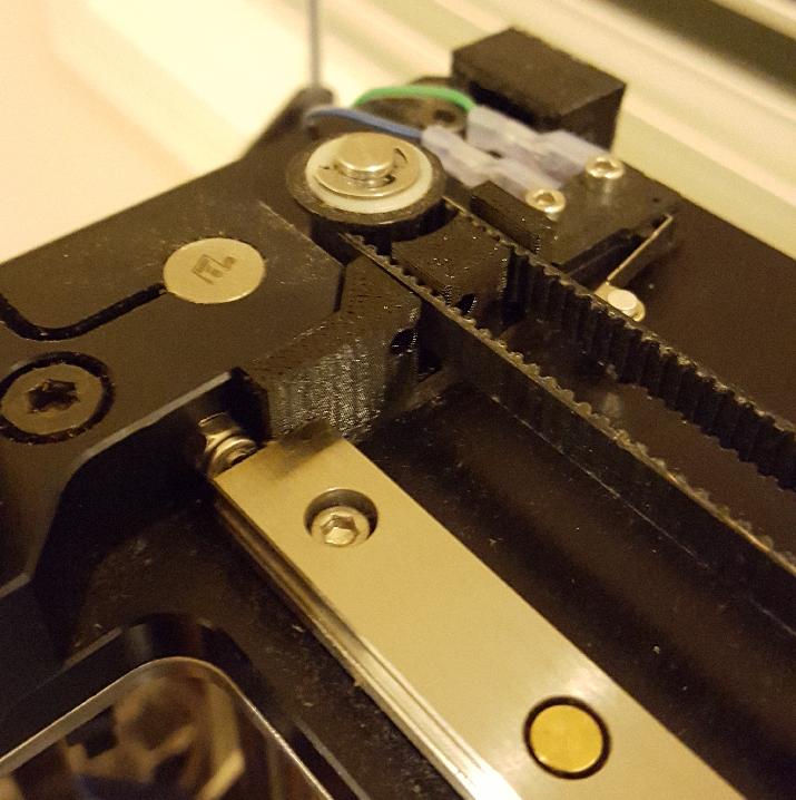 This is the left side end stop block with holes for two magnets (not yet installed). It is bolted to the frame using the machine screws that hold the X endstop switch. The belt passes through the slots without touching.