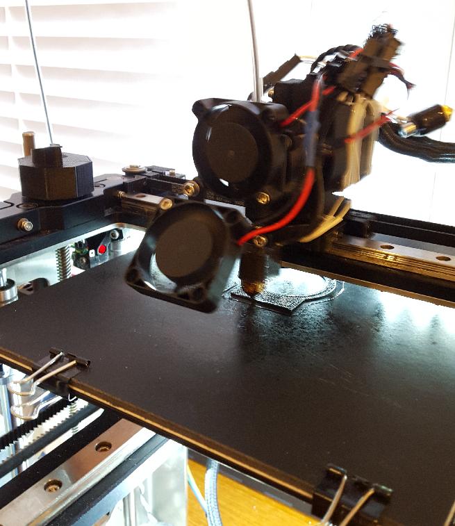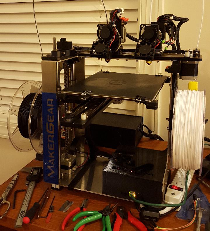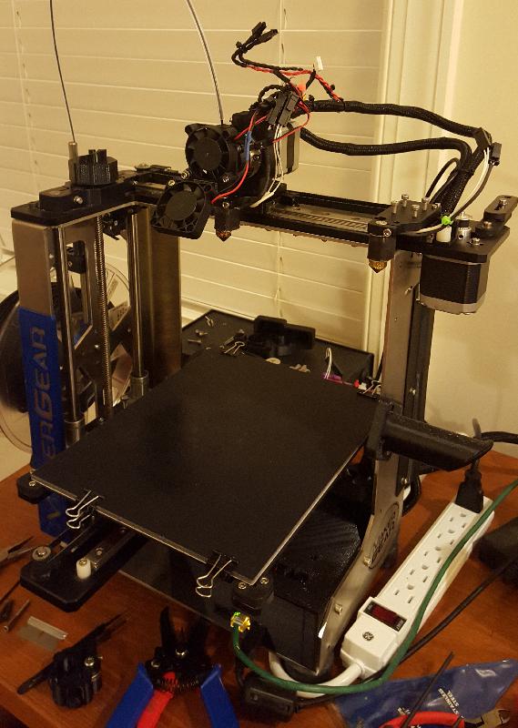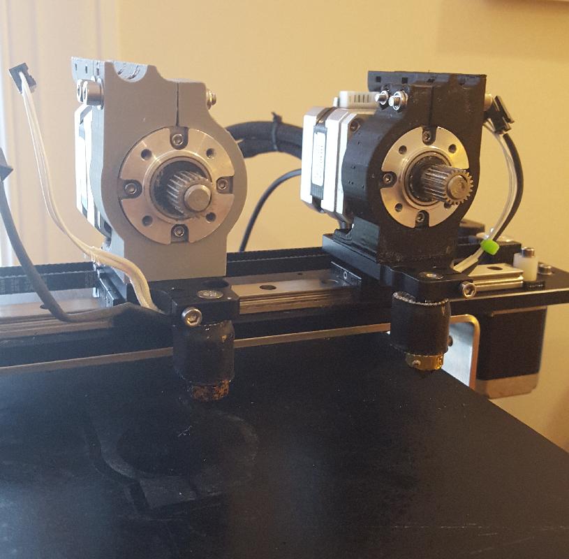 In mid-project, with the second linear rail block on the rail, and both mount plates bolted down along with the motor mounts. This was when I realized that the left side extruder, mount plate, and motor mount would all have to be reversed so that the left extruder could be off of the bed when in the parked position.
