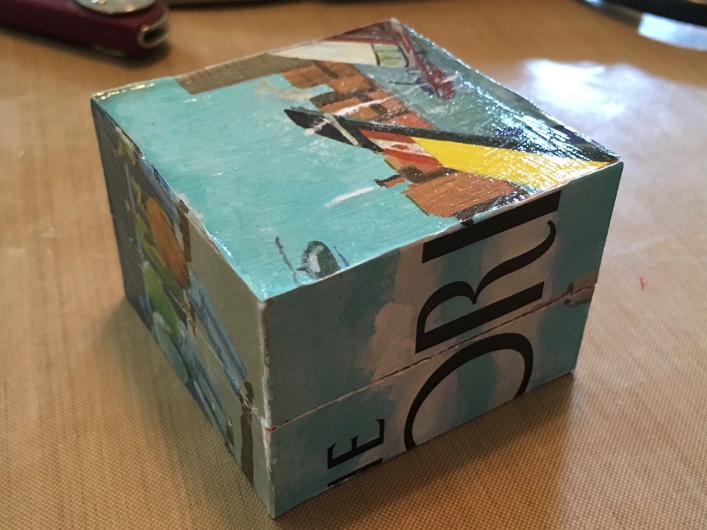 Then I decided to give it a go with its traditional use in découpage, or "the craft of gluing paper onto things". It gives an interesting look to planar prints where it can be applied. Here's my result; note that it is my very first try at this, I made a lot of mistakes and it's not the best example of the craft.