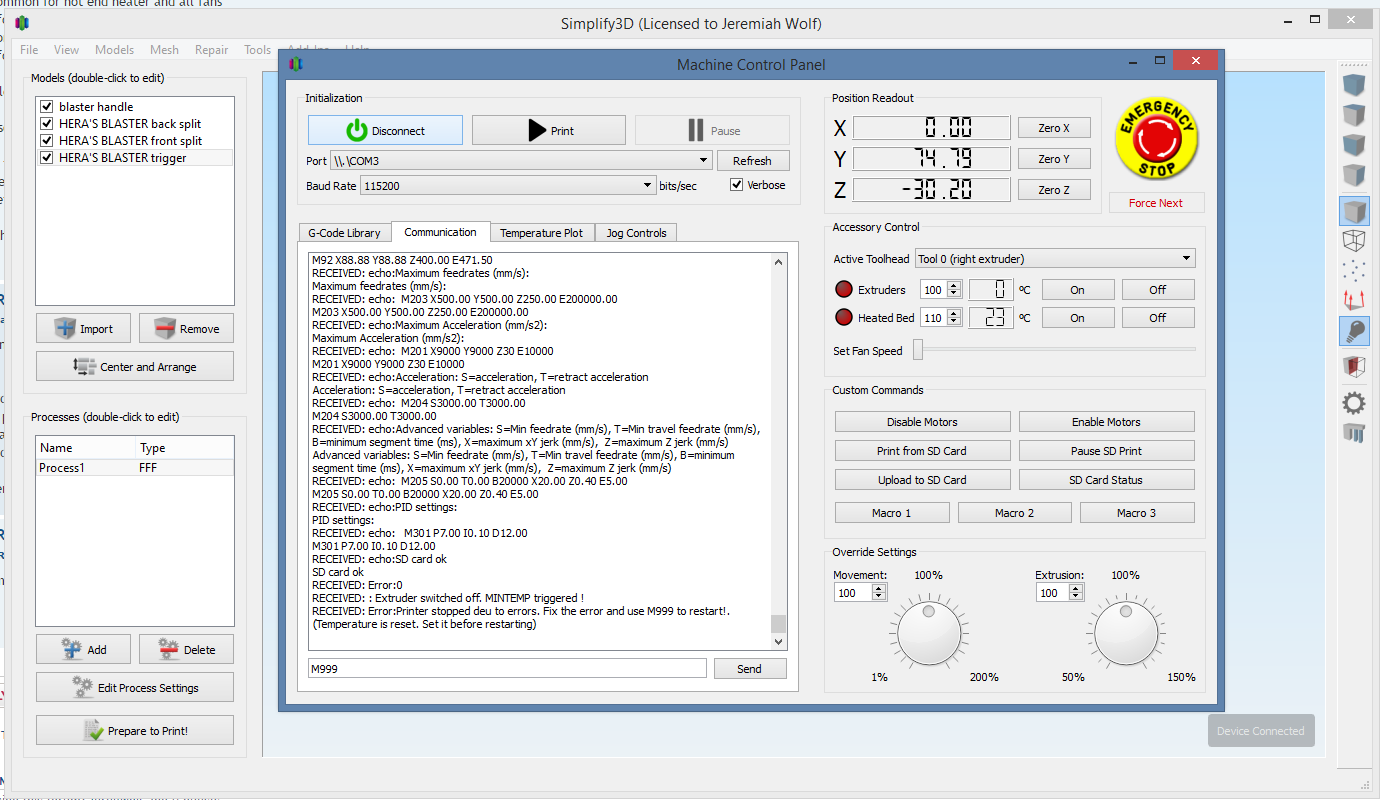 After I reconnected, this MINTEMP error is what I got. So my extruder temp is stuck at zero. I haven't figured out how to fix it.