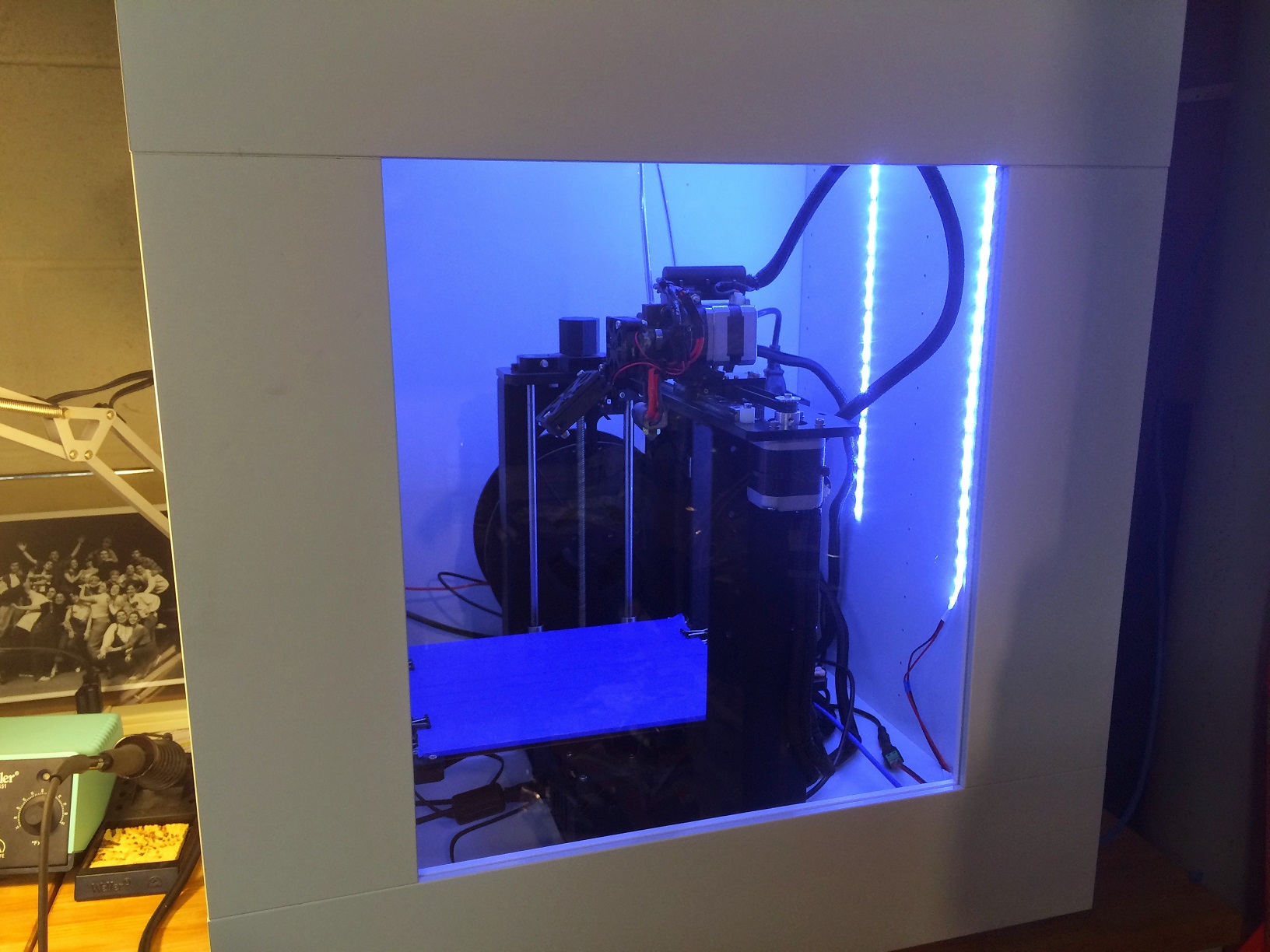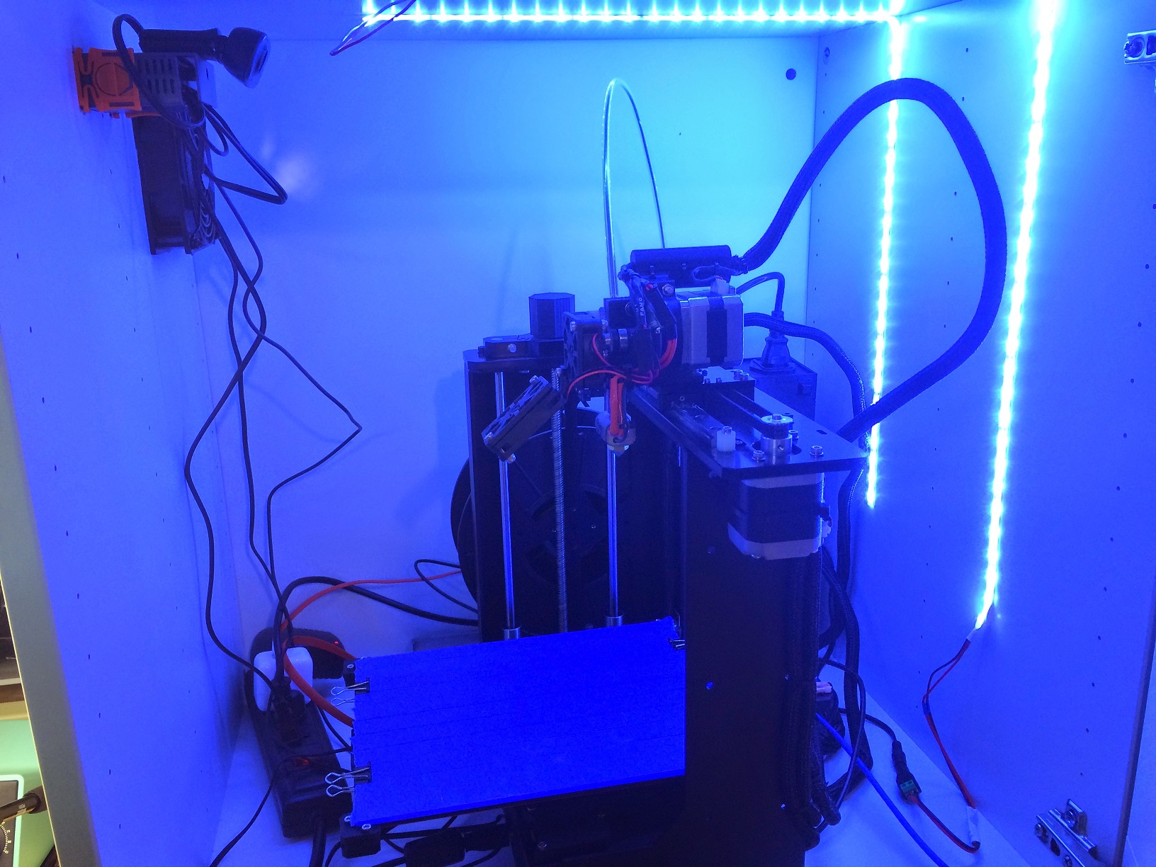 Here's mine, 90% of the way done. Everything is installed and working, though. Need to print out the holder for my webcam, mount the Pi (for octopi) to the wall as well, and do some wire management. Also, the LEDs while blue-tinted are nowhere near that blue in person. They're also remote controlled, which is both neat and fairly unnecessary at the same time!