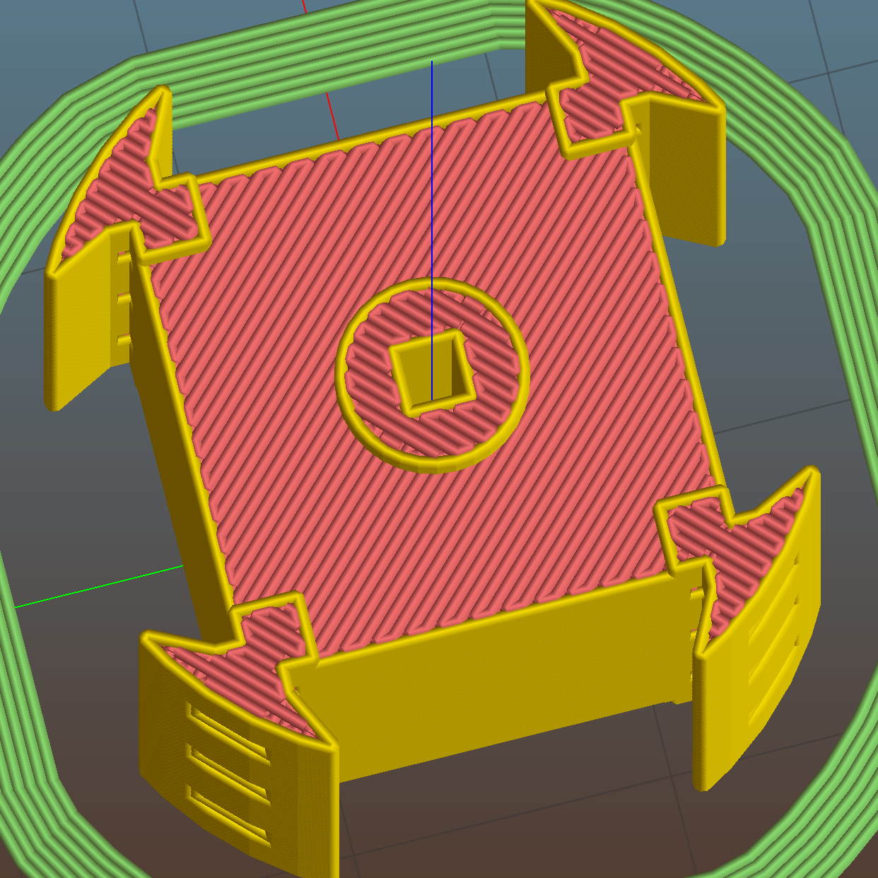 The OD is 25 mm and the strips are 12 mm wide, so there's not much room for the four mushroom shapes that support the platters. Two perimeter threads choked off all the infill, so I had to go with one. The usual 15% 3D Honeycomb infill provides enough strength, but I wouldn't want to use it for anything structural!