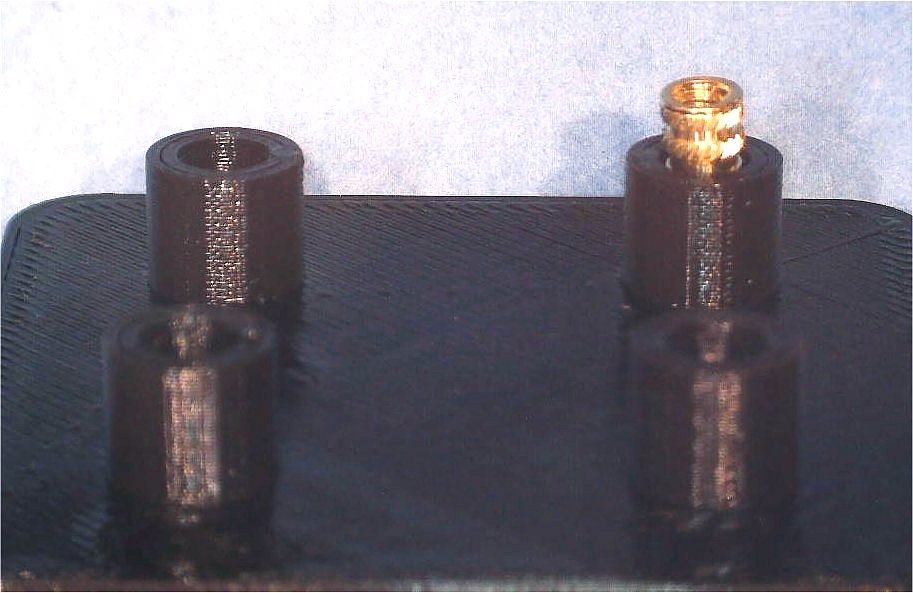 The first circuit housing went very smoothly, with 6 inserts installed. I'm running the tip at about the upper end of the nominal print temperature range. The inserts go in smoothly, but with just a bit of force. There's a tiny bit of "bounce back", where the inset wants to push back out of the hole a little, but if you let the iron/tip sit for a few seconds, that seems to relax & they stay put. They appear to self center nicely, and all the threads lined up very closely with the mating circuit board & hardware holes.
