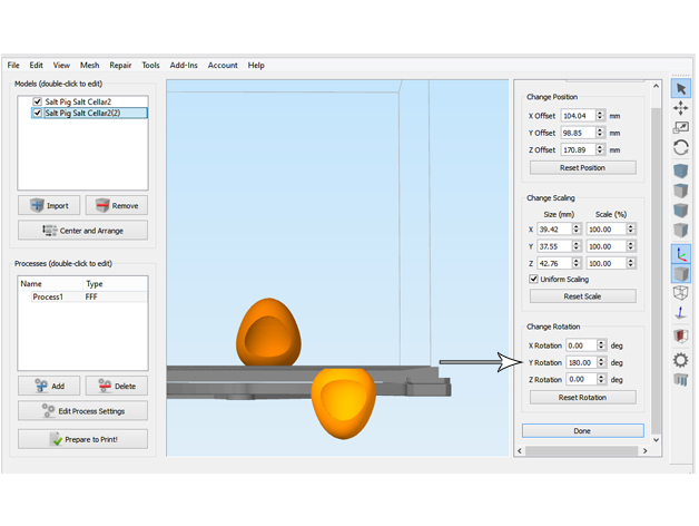 2. Select the copy and rotate it 180° around the X or Y axis. (Double click on the copy to pull up the menu.)
