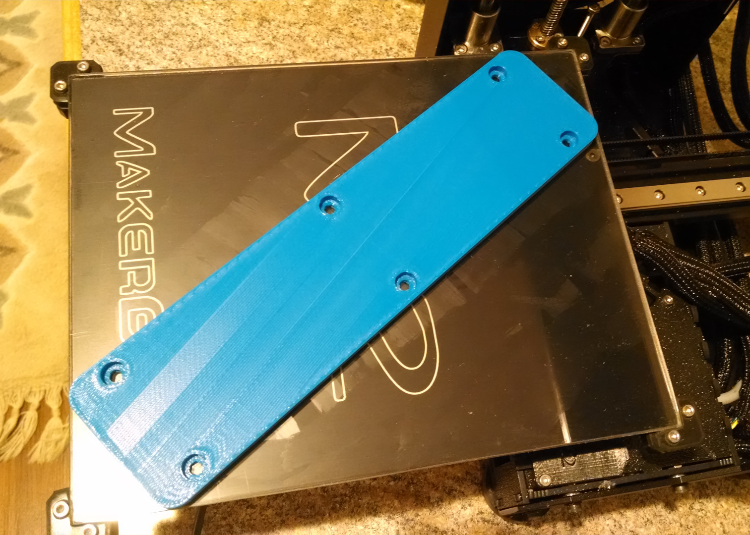 Thanks. I printed it with Makerbot blue PLA (their Greenwich store is walking distance from my office so it's just too darn convenient). I printed with rsilvers optimized PLA 0.2mm profile using S3D. 50% infill (probably could have gone a lot lower). I designed it in Autodesk Fusion 360, sliced with S3D, and I've got a Raspberry Pi running OctoPrint controlling the printer. Extruder temp was 225, bed temp 60. I printed on the glass prepping the bed with Elmer's Disappearing Purple Glue Stick which seems to give more stick than hairspray. Didn't have enough room on the bed for a brim and I even had to remove the binder clips. Didn't realize until today that I could have tried printing it on edge which would have given me a couple more millimeters if I had needed them. The piece did completely stay stuck to the bed, it was hard to get off the bed when done though I was a bit impatient and didn't let the bed cool enough before trying to get it off.