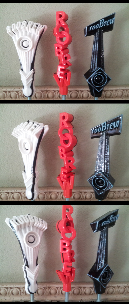 Hello, I have been working on these RooBrew tap handles for quite a while. They are all around 9 inches tall, modeled in Maya, printed in ABS. I used cold acetone vapor to create the smooth surface.The black line was added by changing the filament color during the print using pause and resume. On the black vintage tap handle I painted blue highlights, and tried to make it look old. It was a fun project, and now I get free beer from my friends home brewing for the rest of my life.