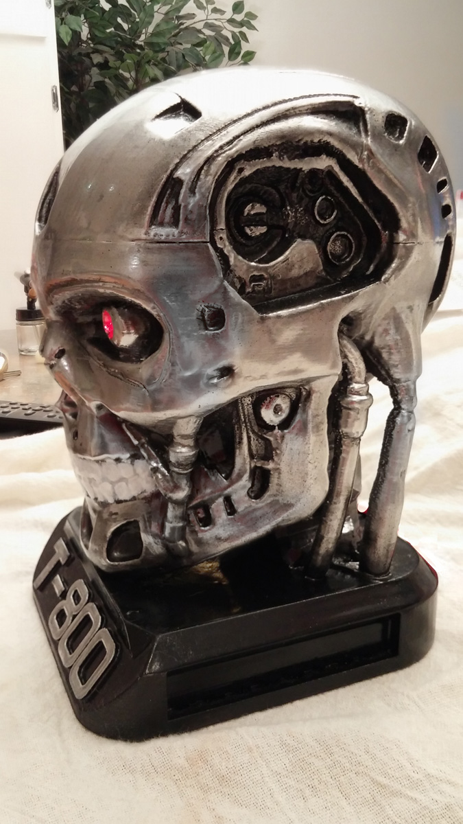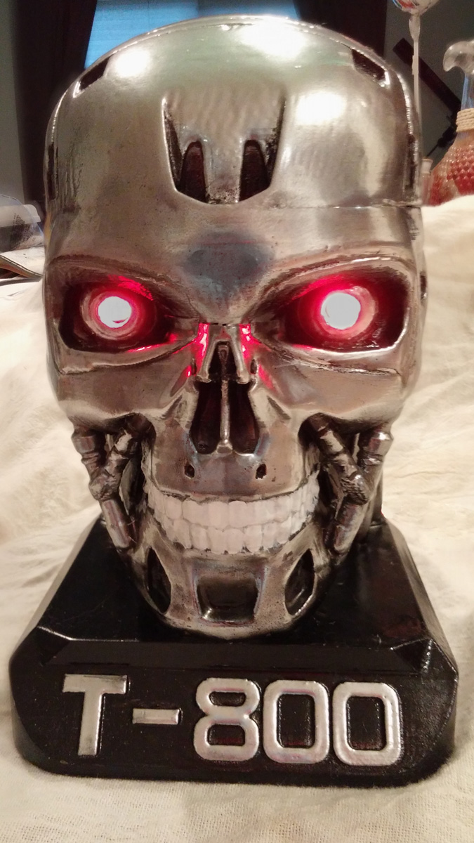 Terminator exoskull from Thingiverse, PLA, around 8 inches tall. Took about 8 hours to print.