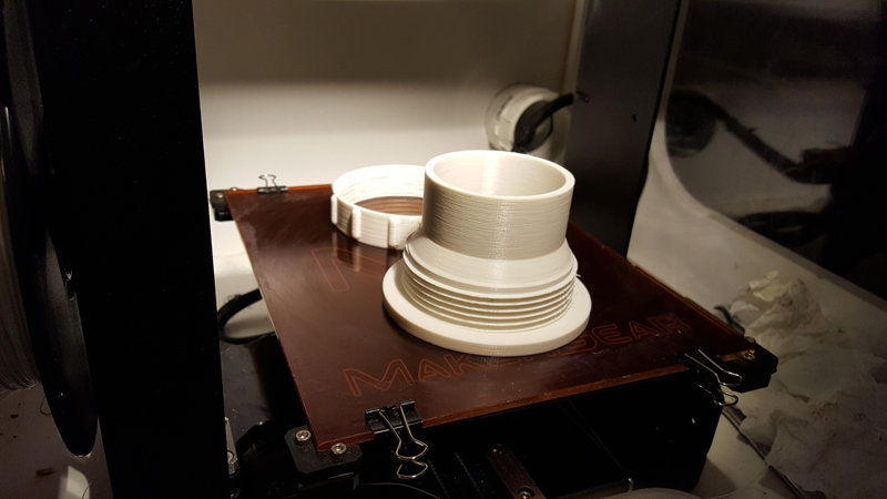 Here's a couple more useful pieces for making a cabinet ventilation system. A 3" flex hose will fit perfectly on the outside of the fan exhaust, which is much easier to route than PVC so that's what I'm using. So I made a matching panel mount fitting that uses the same hose/pvc connector and same threads/nut for connecting the vent hose to the outside exhaust port. I've got five of these mounted in a window box as seen below, with a piece of silk screen over the hole to keep bugs from coming in. I also made a rubber cap that is intended to be printed with ninjaflex or similar TPU so that you can plug the exhaust ports when not in use to keep cold air from coming in during the winter.