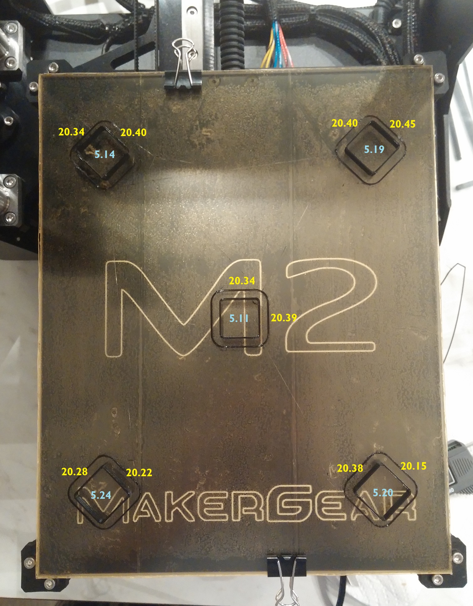 Squares printed pretty well, or at least as expected. The middle square had the best adhesion and the best first layer... and consequently the lowest height. The top left square was a close second, and the other outer ones were about the same: weaker adhesion and not quite squished first layers. I measured the thicknesses (in blue) and the sides (in yellow). Pics below. I also added my print settings. What can I do to minimize the apparent central bowing effect?