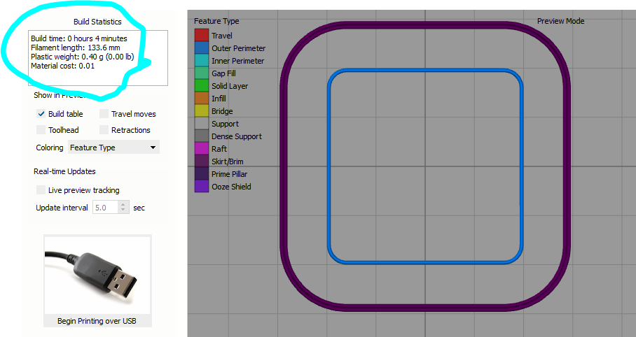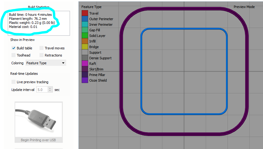 Perimeter only box, same as the ones I posted in the pic earlier. I did make a discovery, however, when preparing to do the extrusion calibration Ed mentioned. Someone said to "merge all outlines into a single model". When I did that, the print preview looked exactly the same as before, but the estimated filament weight and length usage dropped by about half. This implies that the walls will now only be 0.4 mm thick.