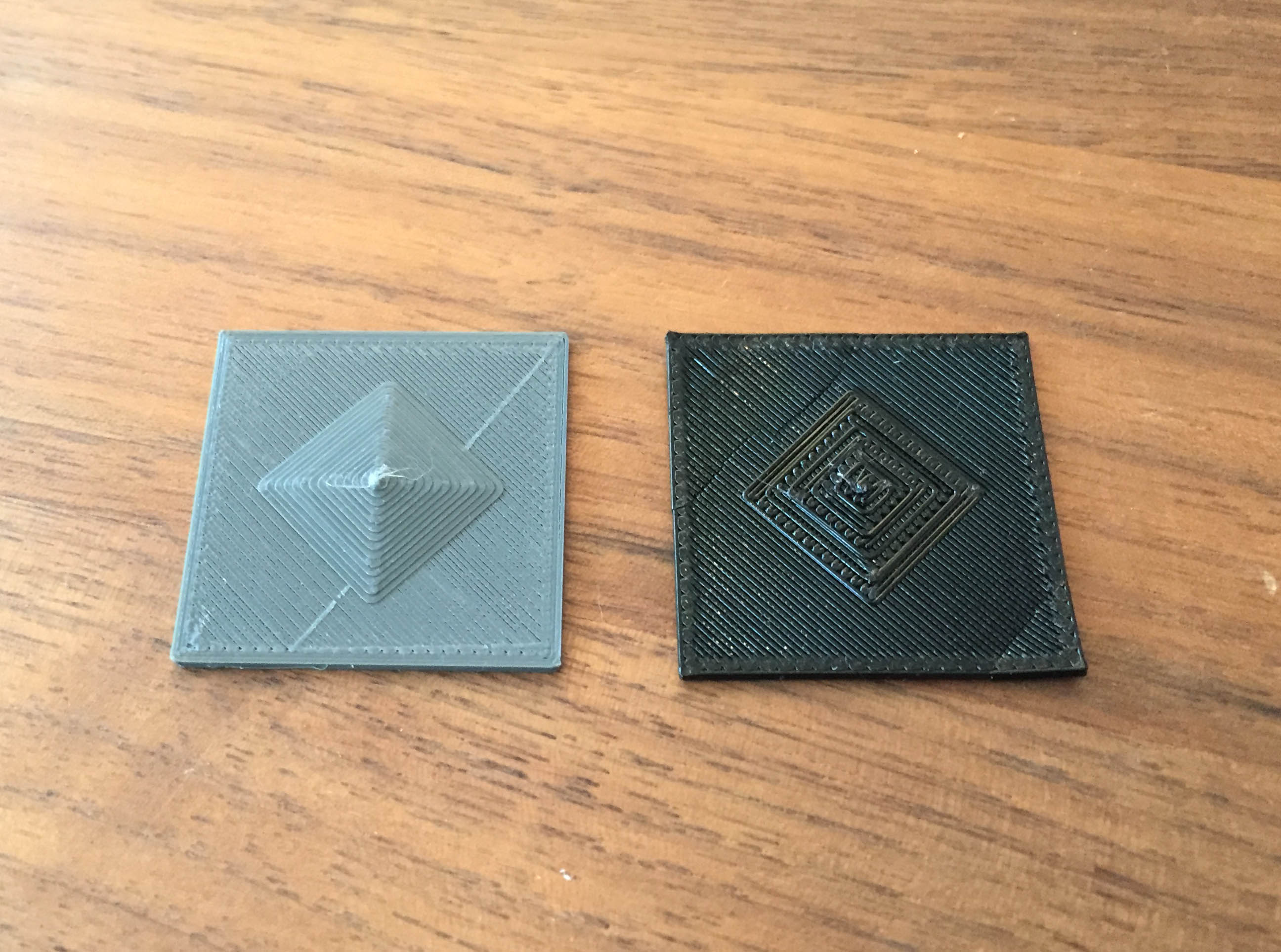 Good, solid extrusion should leave the top layer looking almost flat to the point where you cant drag your fingernail across the lines and get and vibration, if that makes sense. Everywhere on the black piece is underextruded and by a lot. The grey piece is significantly better but is still underextruding, except the lower center portion and some of the left side, which isnt perfect but its getting there. If you look at the lower center part of the flat surface on the grey print, you'll note that the surface finish looks much smoother and consolidated when compared to the rest of the top surface.