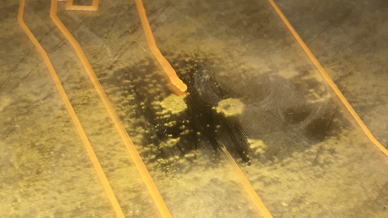 looks like there is a spot on the kapton that is missing adhesive and you have no adhesion in that clear spot on the bed. if the filament doesnt stick then the nozzle will just drag it