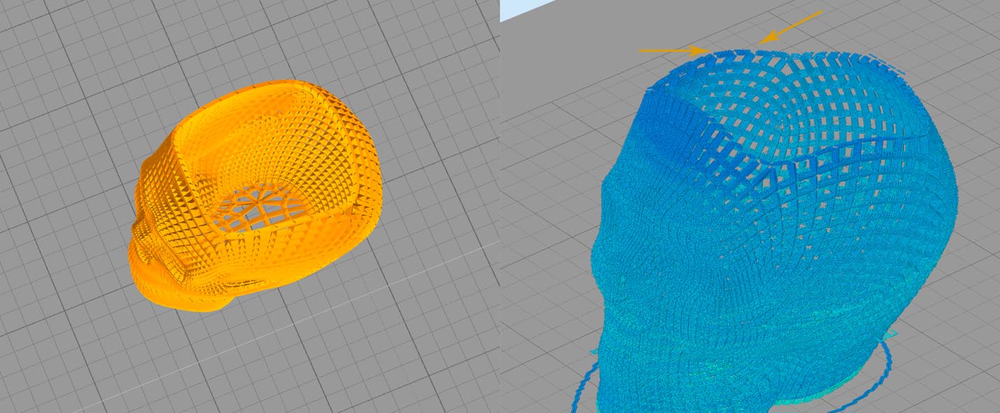 The walls of the skull in the file are too thin for a 0.35 mm nozzle as it is designed. Originally you were using 0.40 mm extruded thread width, and that was yielding walls that were too thin for a solid structure. So i tried to reduce the extruded wall width to 0.36 mm (the lowest you can go and get correct placement with a 0.35 mm nozzle) and did a slice. As shown below where the arrows are, you still do not have a solid structure.