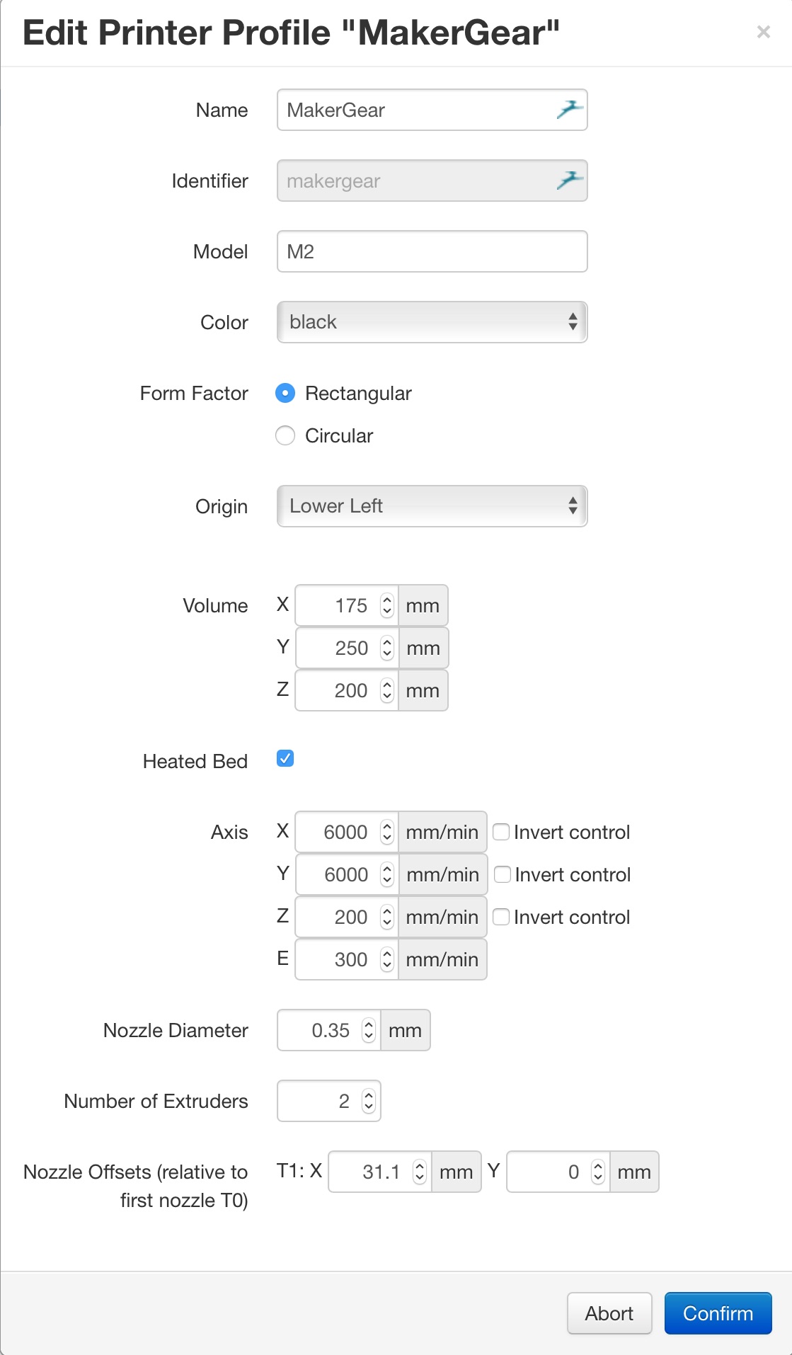 Shouldn't the volume be X = 200mm (technically 203), Y=250mm (technically 254), and Z = 200mm (technically 203)? Did you shorten Y to account for the clips? Is that why you have 170mm?petej wrote:Here's my Octopi Settings screen (I have a dual-extruder machine. If you have one extruder, adjust the last two settings.):