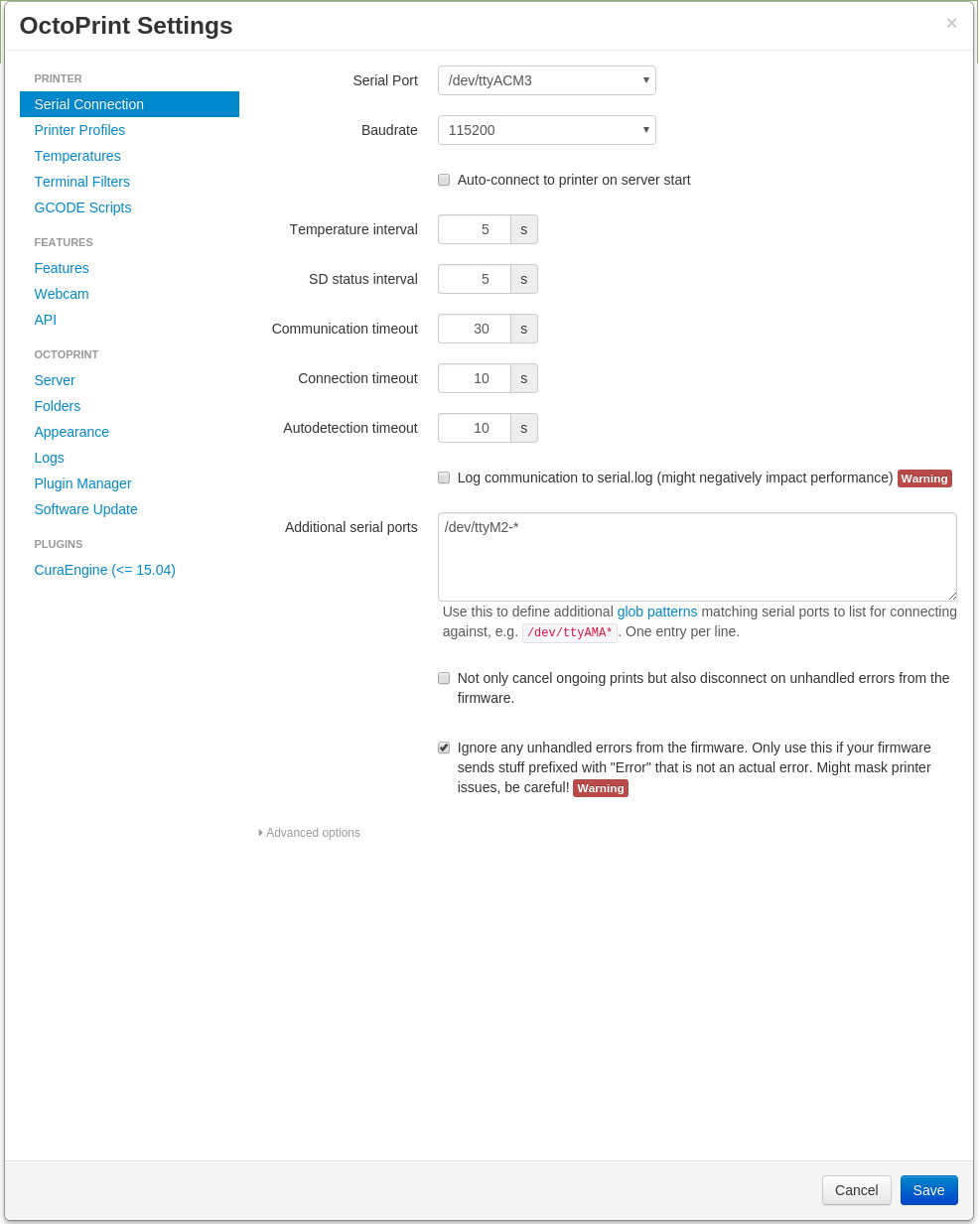 For anyone setting up Octoprint for the first time, I suggest increasing the wait time on the communication settings. The communication timeout in one of the older OctoPi images was set very low. It can take nearly 30 seconds in some cases during a power failure or restart to reestablish communication. I believe the default was 5 seconds.