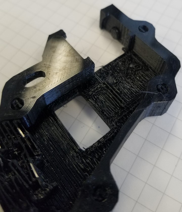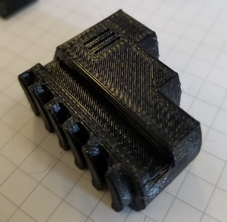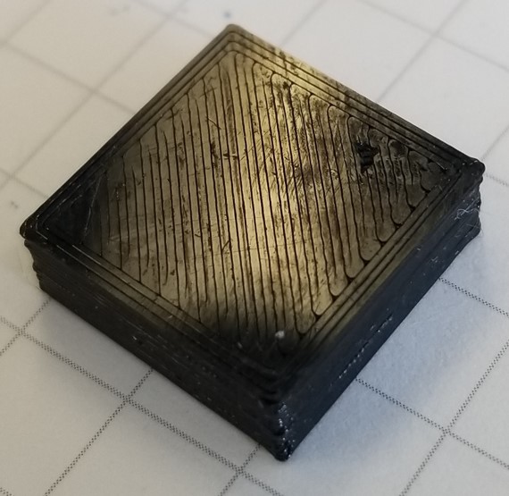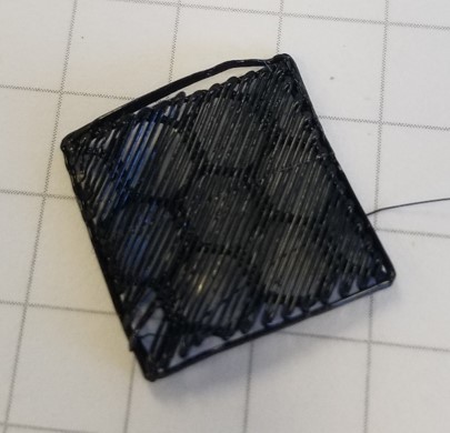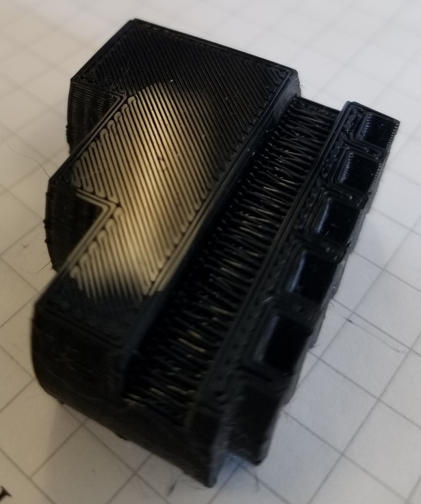 After running airscapes' test print and process I got height and thickness for the 26mm x 26mm x 2mm thin box of 2.06mm height and .406mm thickness with first layer height of 90% and extrusion multiplier of (I think - I don't have it in front of me) .91. No pictures of that since there's no fill. By this point I was tired of boxes, so I printed a spare part to see how the fill turned out: