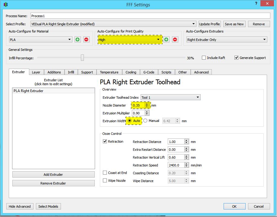 The bad news is.....I've never tried to do it, so I can't give you an easy set of "plug-this-in-and-go" numbers. But you do need to use those profiles for the duals, (the scripts are optimized for duals), so you're just going to have to adjust rather a lot of the settings in them and build a set that works for the smaller nozzle.