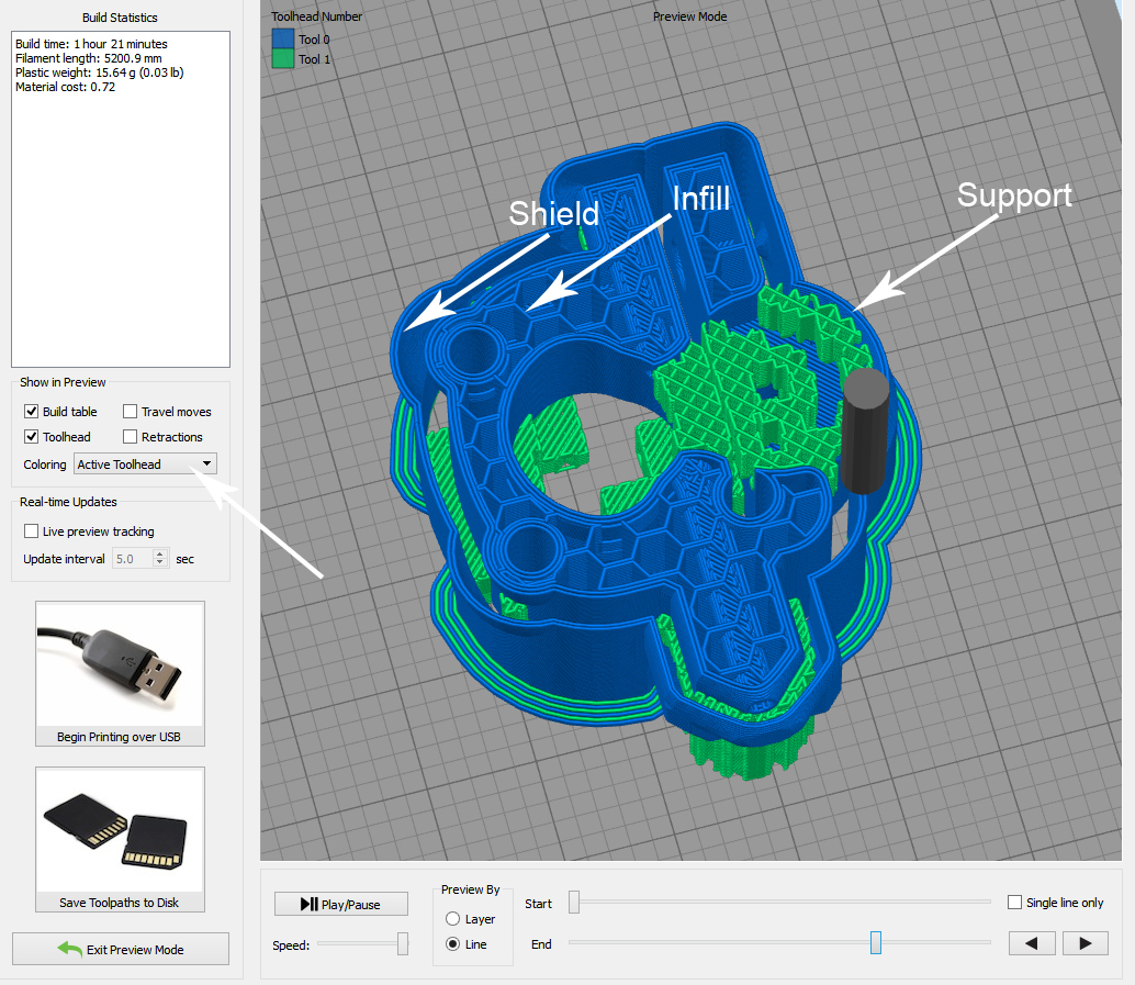 I have not yet experimented with Tool change code – these use the available S3D settings. Because of that, things like Brims and Shields are necessary – In addition to adding stability and catching drips, they correct another bug in S3D that does not reverse a retraction on the inactive tool head for the first layer.