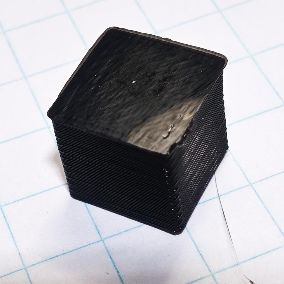 The film can be bended while the cube stays in place (r~1cm): After bending further than, that the cube came off easily: Bottom surface quality was ok (smoother than my Kapton prints): View from below after bending: According to some posts online the max temp for monochrome laser film is 190°C, this is why I used color film (220°C).