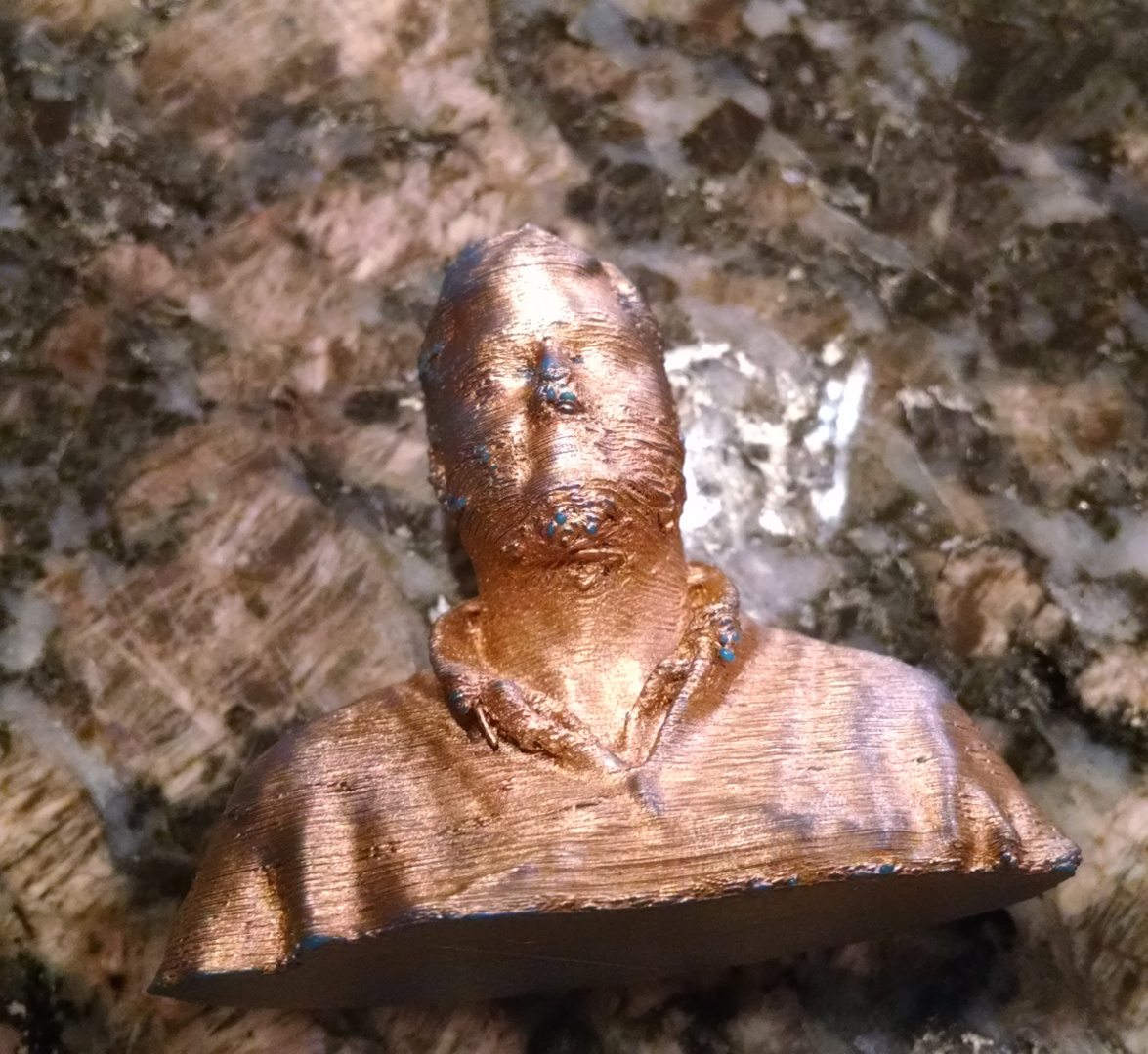 Here's a sample. It's a pretty small statue (about 1 1/2" tall) and I printed it in blue PLA. Then when I got the idea of the Rub N Buff I figured what the heck. You can see some blue peeking through. If I were doing this over I'd use black PLA so it would look more normal in spots. I could also give it another coat of gold, but it was so small I was getting in the cracks with a Q tip.
