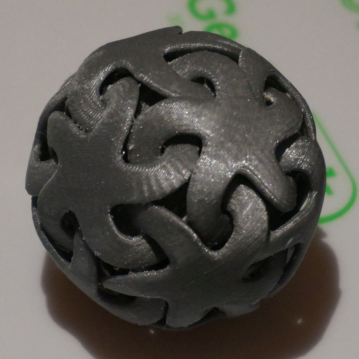 First the good news. BVOH prints like PLA, not PVA. There is no stringyness or oozing. It is rigid like PLA. With PVA I had to reduce temperature on the idle extruder to try to keep all the filament from leaking out of the nozzle while it is waiting. This made for very long print times and it was still a mess. With BVOH you print just like you would with two color PLA. I printed the StarBall on my MakerGear M3 Dual Independent printer at 200 C with a bed temp of 70 C for both the PLA and the BVOH. There was practically no oozing from the BVOH. In fact it oozed less than the PLA. The StarBall is a hollow ball made up of interlocked starfish. The internal support requires a dissoluble support. BVOH worked perfectly for this. Drop the print in warm water and a few hours later the BVOH is gone.