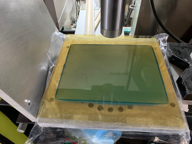 Here's a plate after pressing. The excess PEI gets trimmed away on a band saw then the edges cleaned up on a belt sander.