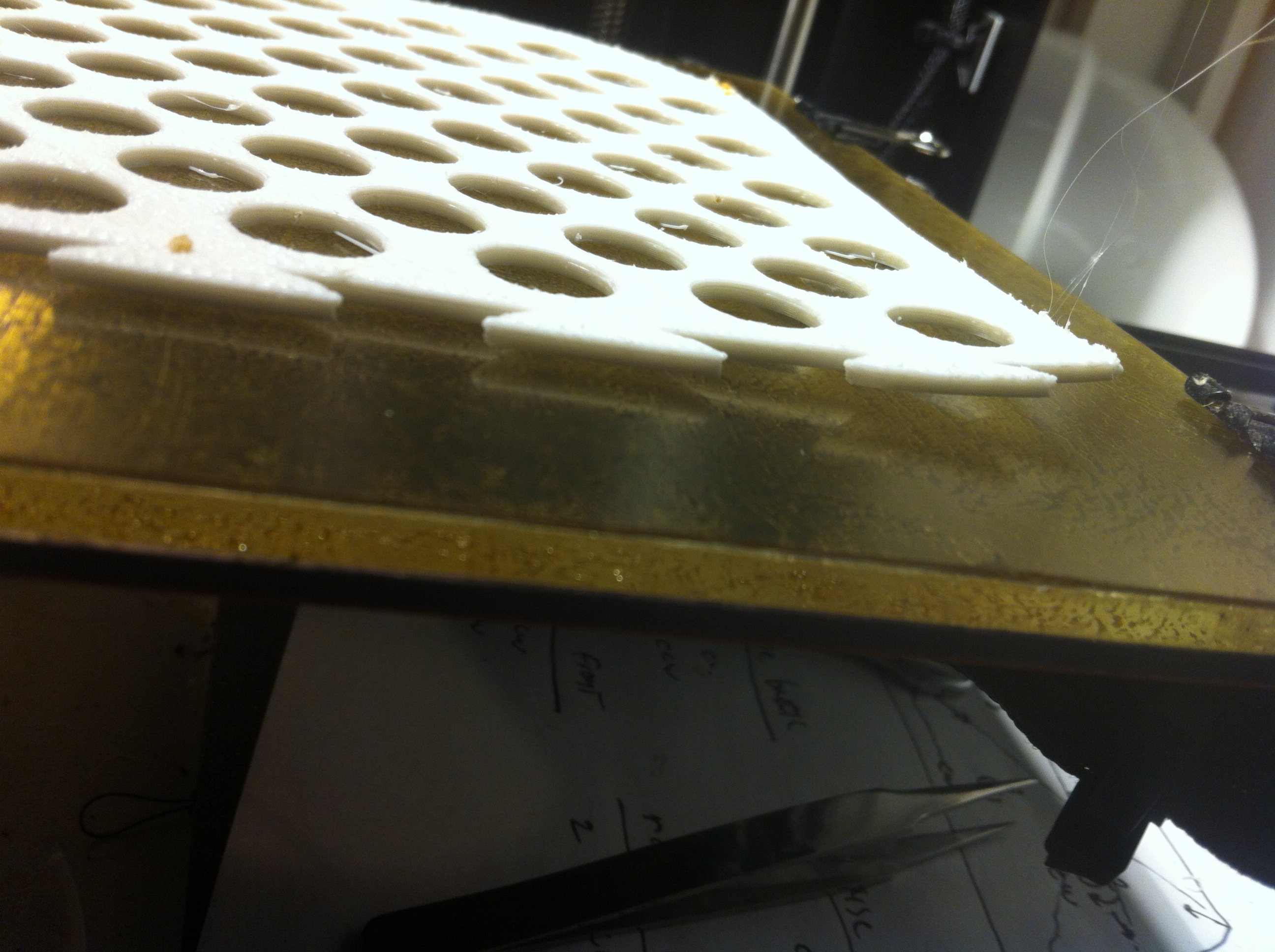 This perforated tray half I'm testing with is a good warp test since it is thin wall tray where one side has no wall. Once the walls start getting printed is when the warp occurs. Having all the holes in the bottom also provides a good test for how even the surface is, since you get a dense pattern of circle outlines being printed across the majority of the platform surface. You can look at each circle to see if the bead is consistent in all areas. Low spots would result in the extrusion not sticking, while high spots would give you a flattened extrusion. I'm not seeing any issues with the surface not being level or having low/high spots though.