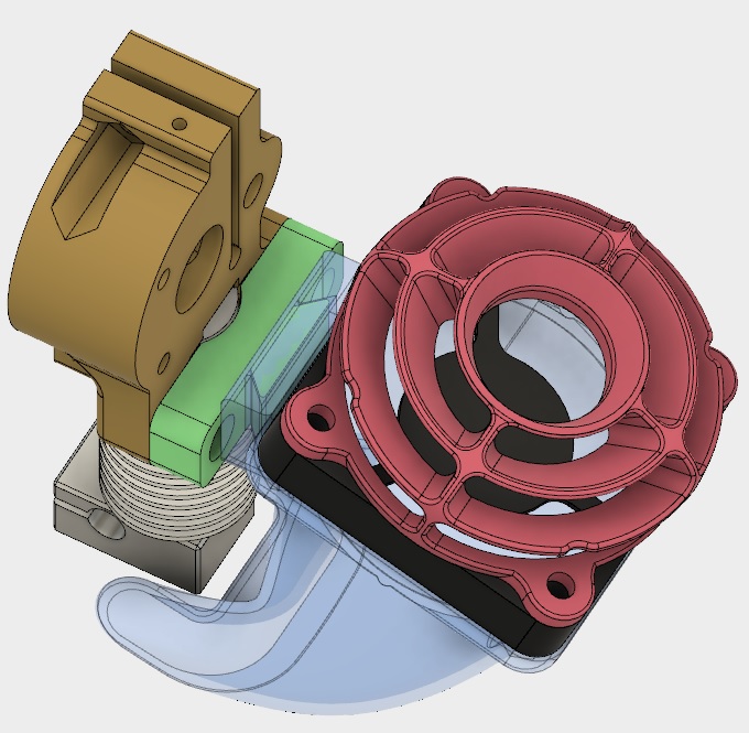 Finished the attachment design and fan guard. Mounting bar (green) is held to the extruder mount (brown) by two machine screws. Duct (blue) attached by means of a dove-tail tab. Should be easy and quick to install/remove. Fan guard is a new design intended to reduce noise level and improve airflow. I plan to use the E3D provided heat-break fan and shroud (not shown) oriented with the fan to the side or rear.