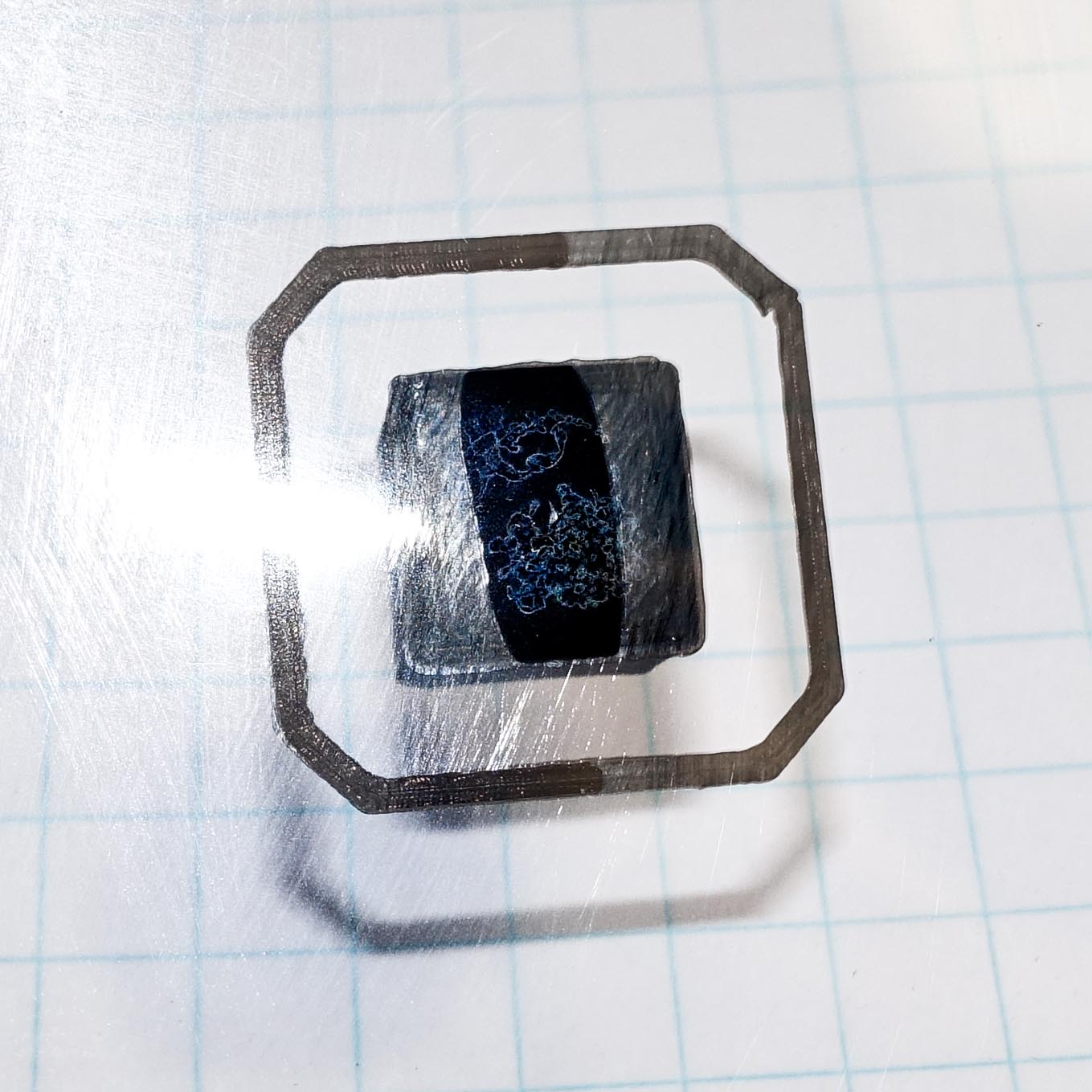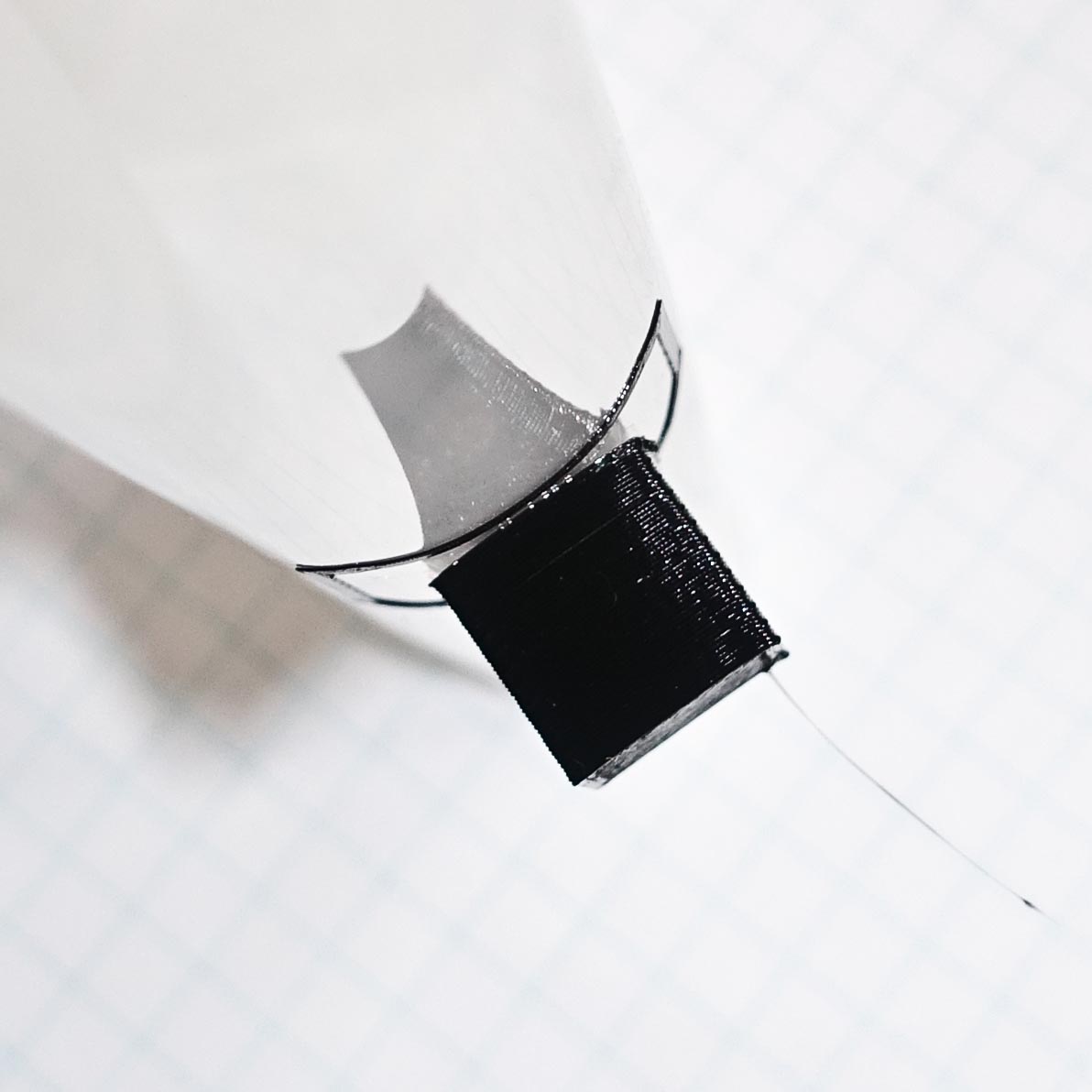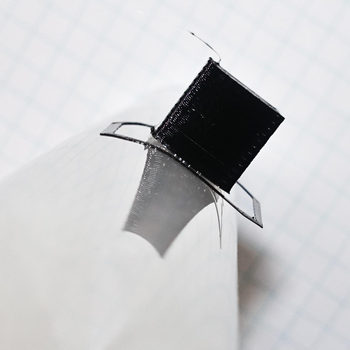 The film can be bended while the cube stays in place (r~1cm): After bending further than, that the cube came off easily: Bottom surface quality was ok (smoother than my Kapton prints): View from below after bending: According to some posts online the max temp for monochrome laser film is 190°C, this is why I used color film (220°C).