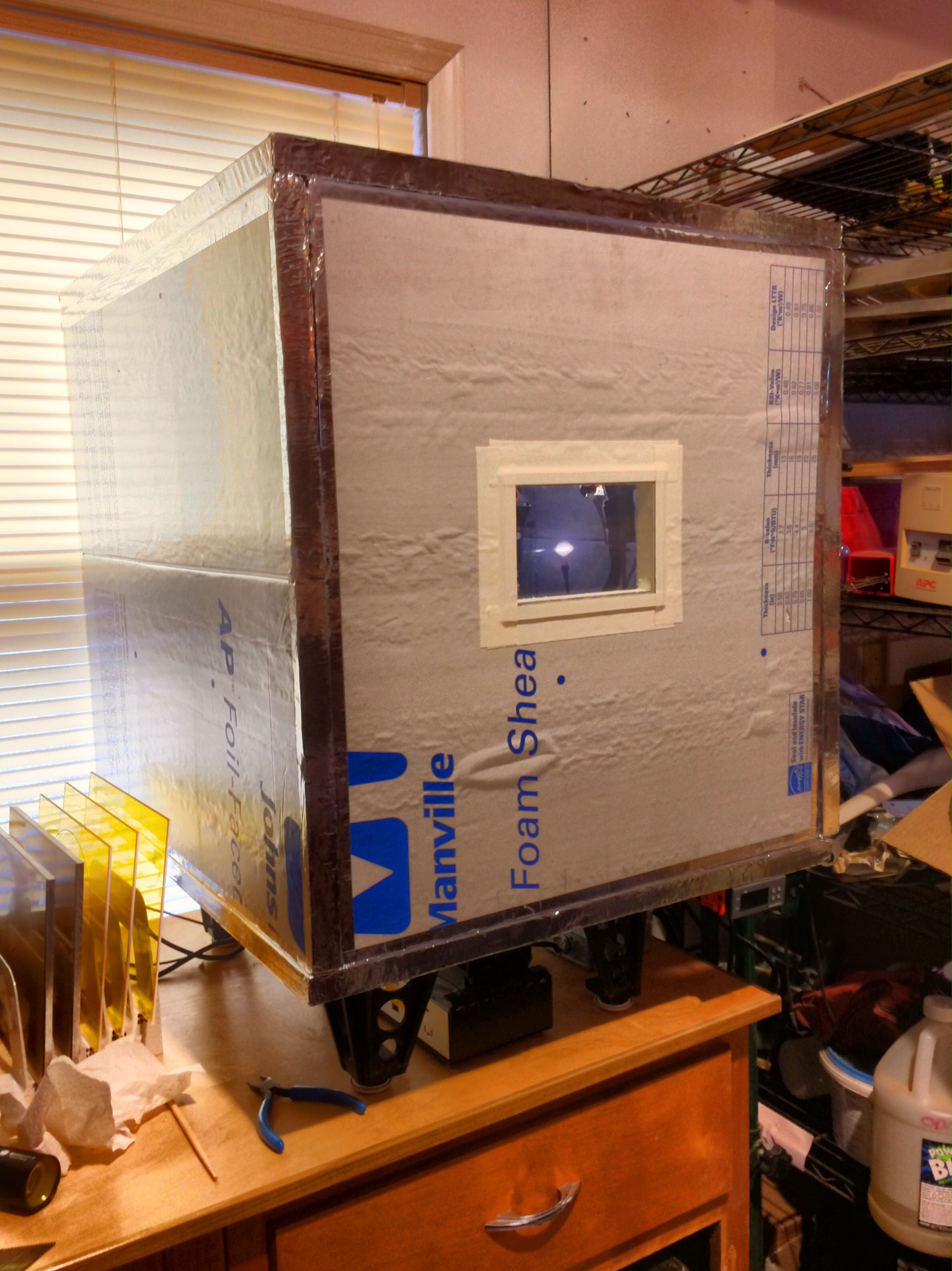 This is made from 1 4x8 sheet of 1" foil-faced foam insulation and a roll of aluminum foil tape. The dual pane 5x7 glass window is just taped on for now. I'll make a frame/bezel to mount it in the foam.