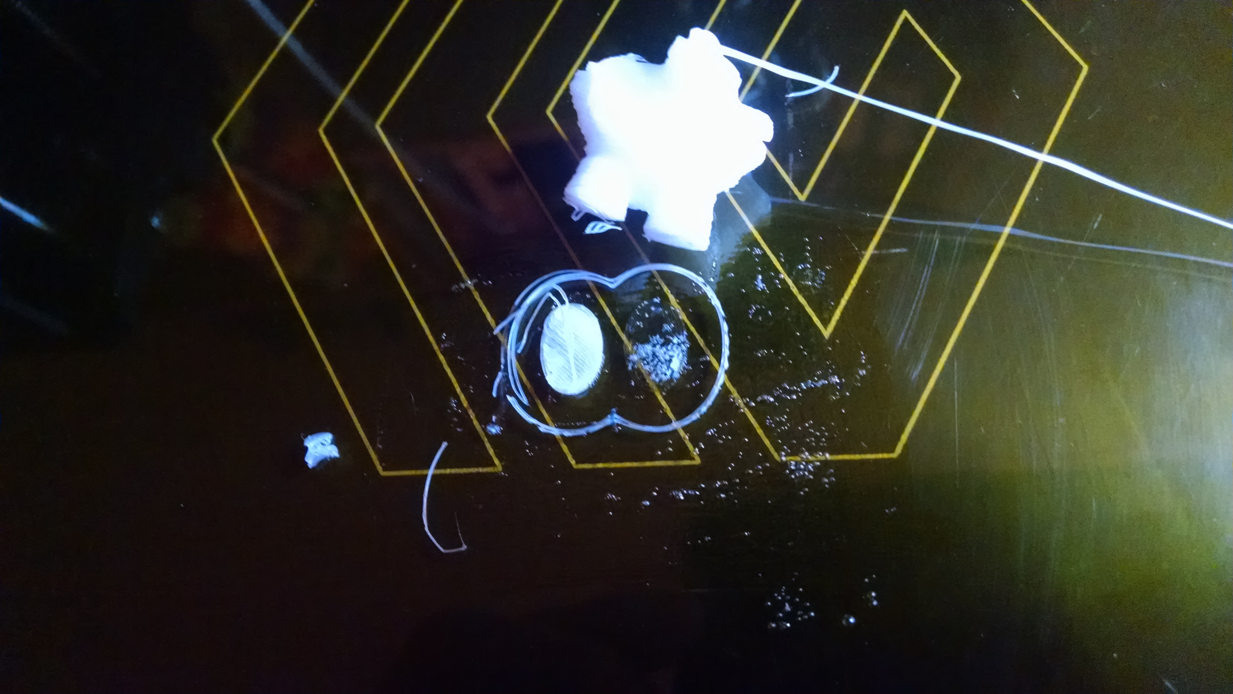 I thought that nothing was easier to print with than PLA, but I think I have changed my mind. This stuff sticks to anything (the bed temperature of 60C above is only because I was using PVA as support for PLA), including room-temperature glass, other filaments, etc. It is thought to be pretty much useless for anything other than support material, because it absorbs moisture like crazy (it's water soluable, after all!). I'd like to try printing an actual object with this and see how it reacts with the air over time. It's very flexible, but not particularly stretchy. It gets a stretchy when soaked in water, but then it also starts dissolving and gets sticky, as well.