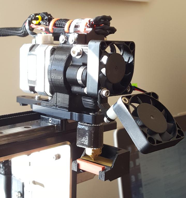 In mid-project, with the second linear rail block on the rail, and both mount plates bolted down along with the motor mounts. This was when I realized that the left side extruder, mount plate, and motor mount would all have to be reversed so that the left extruder could be off of the bed when in the parked position.