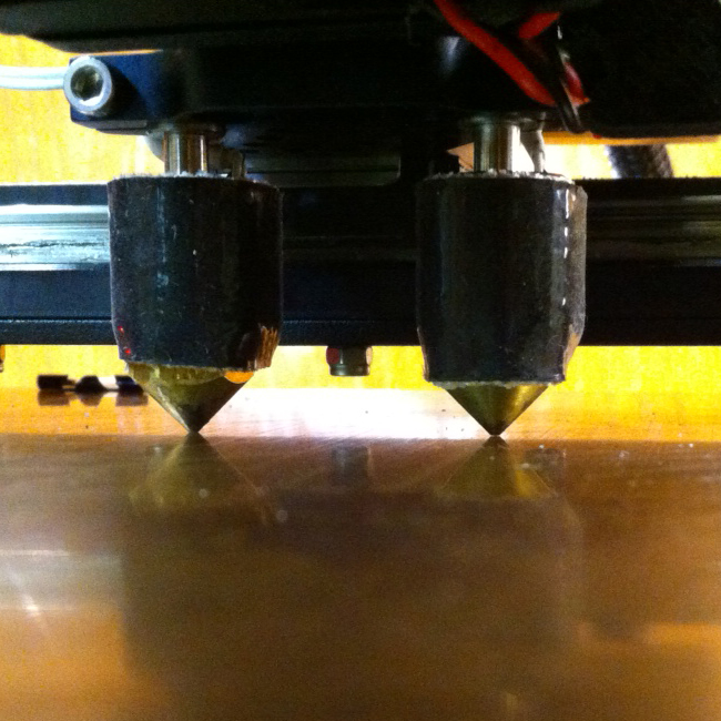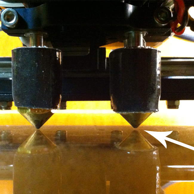 1. Clean any drips off of the nozzles if you have extruded through them. (Tweezers are good for this while the nozzle is cooling off.) You need a clean flat nozzle surface for this.
