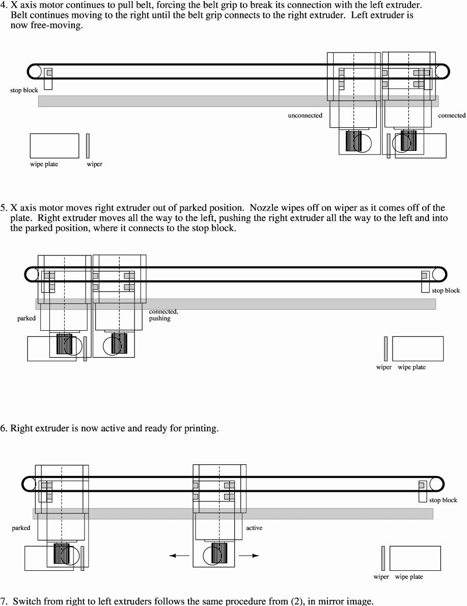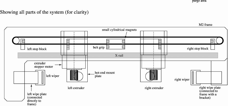 The idea is that the extruders don't need to be directly bolted to the X axis belt, but instead would be allowed to disconnect from it and reconnect. It's necessary to make sure that the extruders reconnect in exactly the same spot on the belt, because any slop in that measurement is an inaccuracy in the X axis position between layers. So the method involves keeping the existing belt clamp mostly the same, but not bolted to the extruder mount. Instead, it connects to the extruder mount by magnets, strong enough to keep the extruder firmly and precisely connected to the belt clamp during printing, but weak enough for the X-axis stepper motor to overcome the magnetic force and pull the belt clamp off (probably this can be done with some kind of mechanical latching system, but I'm trying to avoid having additional moving parts). Instead of one dual extruder mount, there are two independent single extruders, but only one belt clamp. Each extruder has a "parked" position on the left or right side of the bed plate, and when parked, the nozzle sits on a plate that keeps it from dripping. The nozzle wipes off on a wiper as it comes off of the plate.