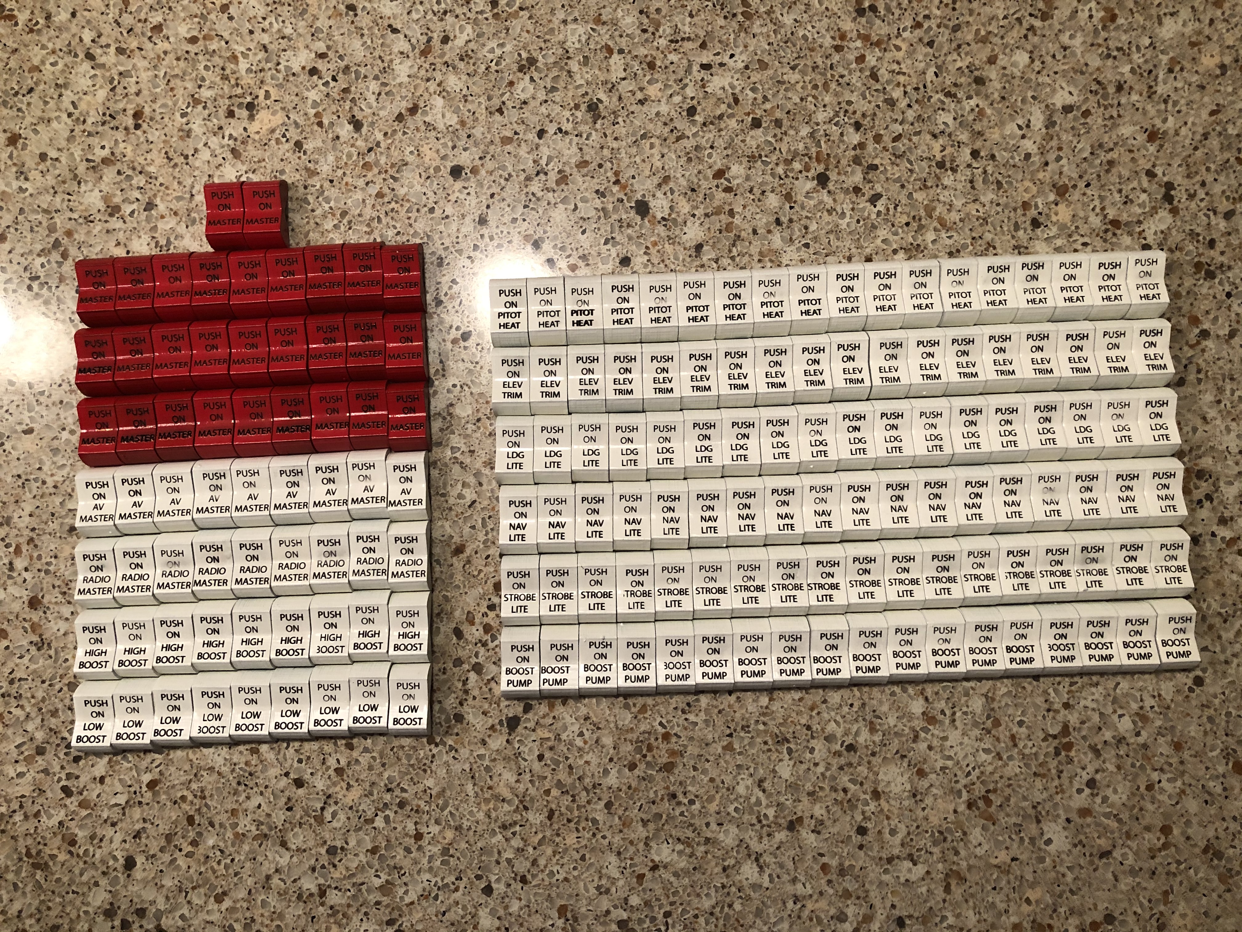 These are switch covers for Mooney aircraft. I use ABS, acetone-based spray paint, and a 50W laser engraver. Someone here, (I do not remember who), suggested the paint-ABS combination. The paint REALLY sticks well.