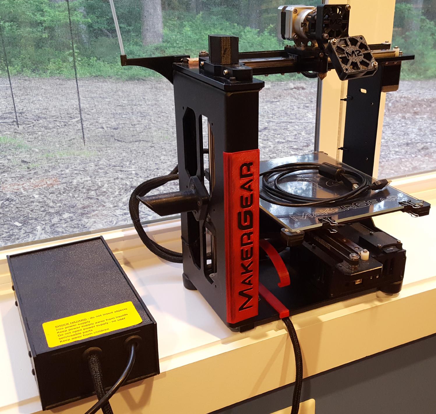 The photo is of a MakerGear M2 that I bought second-hand and donated to the local high school (Poolesville), which has an excellent science and math magnet program that I felt ought to be teaching kids about 3D printing technology on a regular basis.