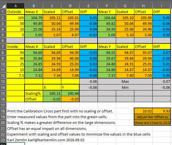 Attached you will find a part I'm calling a Calibration Cross - STL and JPG drawing. It includes internal and external features, both large and small. I have also attached an Excel Spreadsheet (Zipped) which enables (by trial and error) to see the impact of scaling and horizontal offset values in correcting part dimensions.