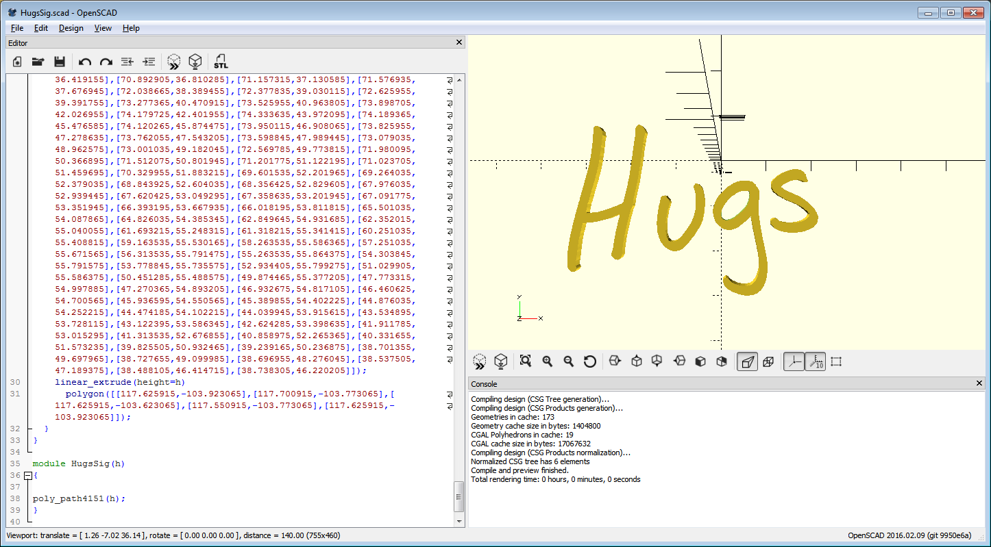 Here's a quick demo I just did using the Paths to OpenSCAD plugin for Inkscape, and OpenSCAD:w22 wrote:What would be the easiest software to use for this purpose? [...] Maybe I would create the signature in a picture and then combine the picture and the print via SVG export and then .STL convert?