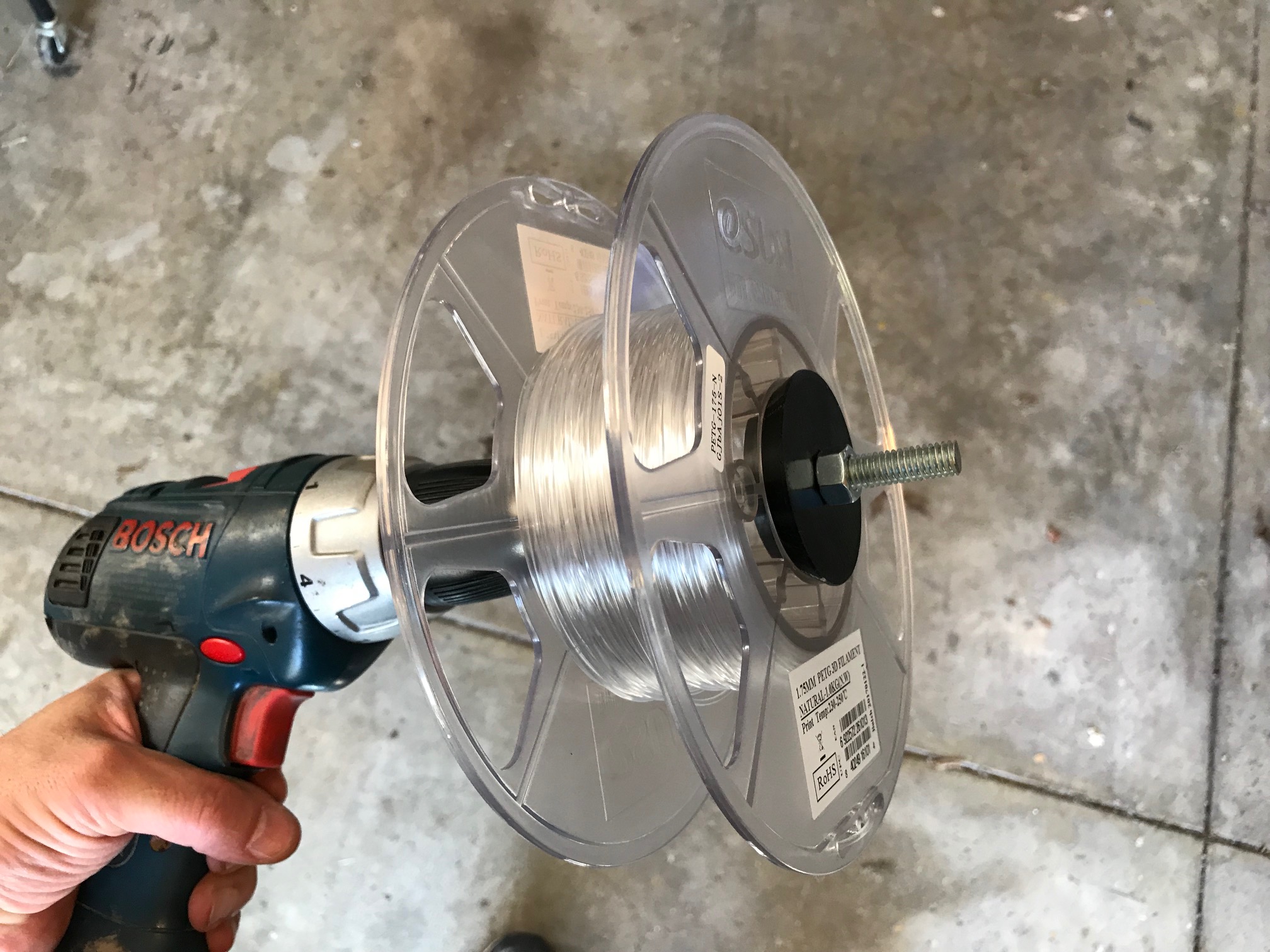 Lastly, there's a spool-core.STL attached. Two of those, a piece of 3/8-16 threaded rod, a nut, and my cordless drill make quick work out of transferring filament from one spool to another. I'll post a couple more photos in a reply here.