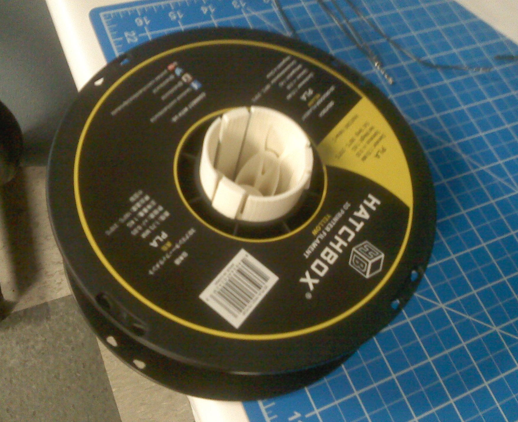 Our tooling guy was tasked with finding a way to avoid having two people each on some of the production machinery when very long wire assemblies stream off. His idea was to use some of the many hundreds of empty Hatchbox spools we have lying around for work-in-progress buffers. He needed a spindle to which to mount the filament spools to a 34-frame stepper. Here it is. Presses onto a 1/2" shaft. Keys with the Hatchbox spool, which snaps in place. ABS. Yeah.... I got a little creative with the spokes. The beauty of additive machining is that complex shapes take very precious little more time than simple shapes, so it might as well be elegant and beautiful as well as functional.