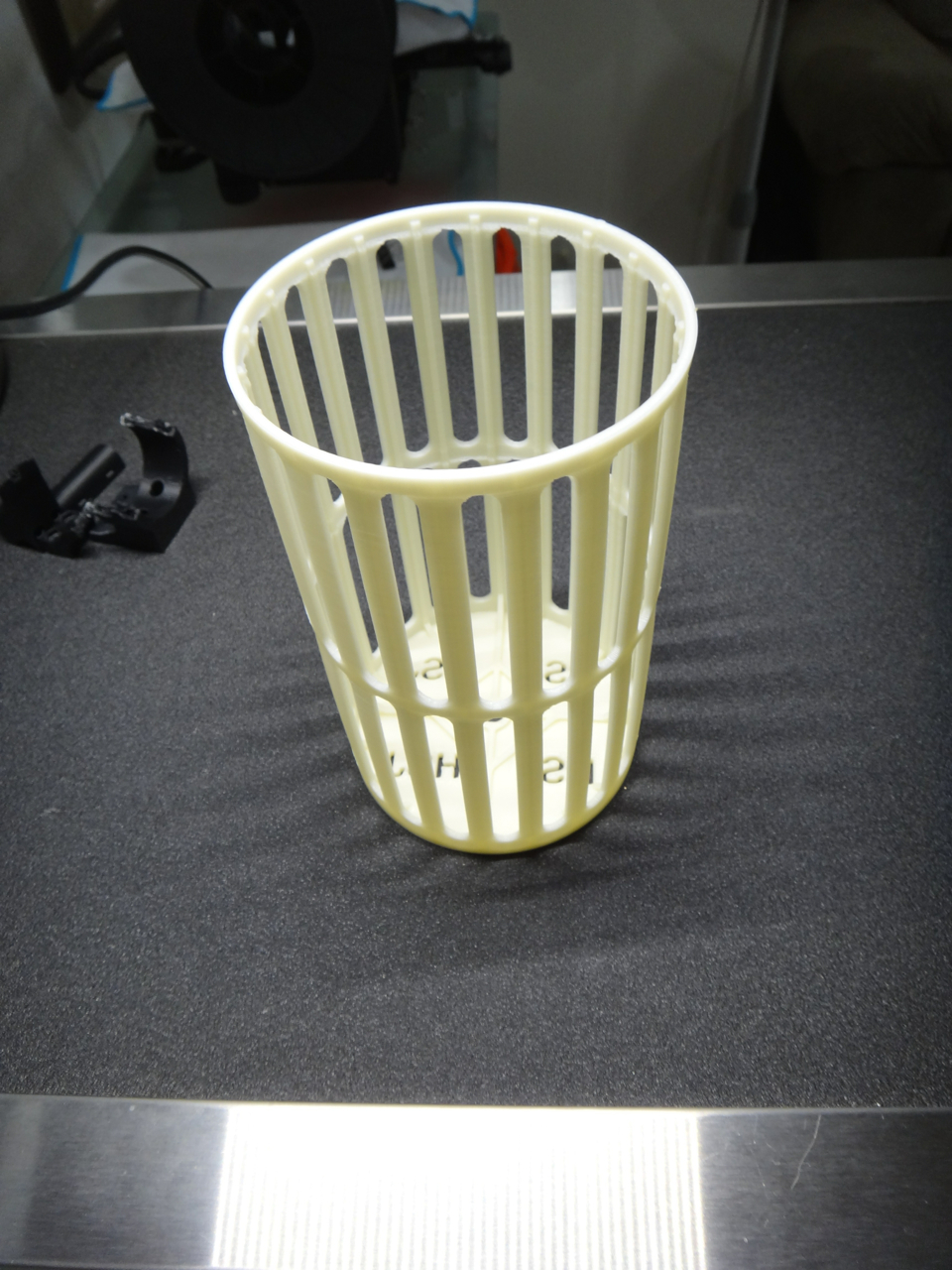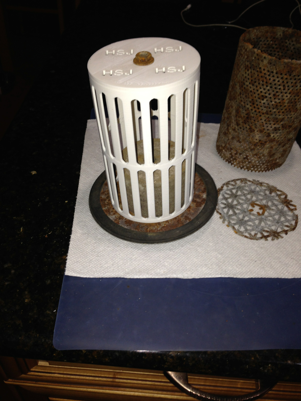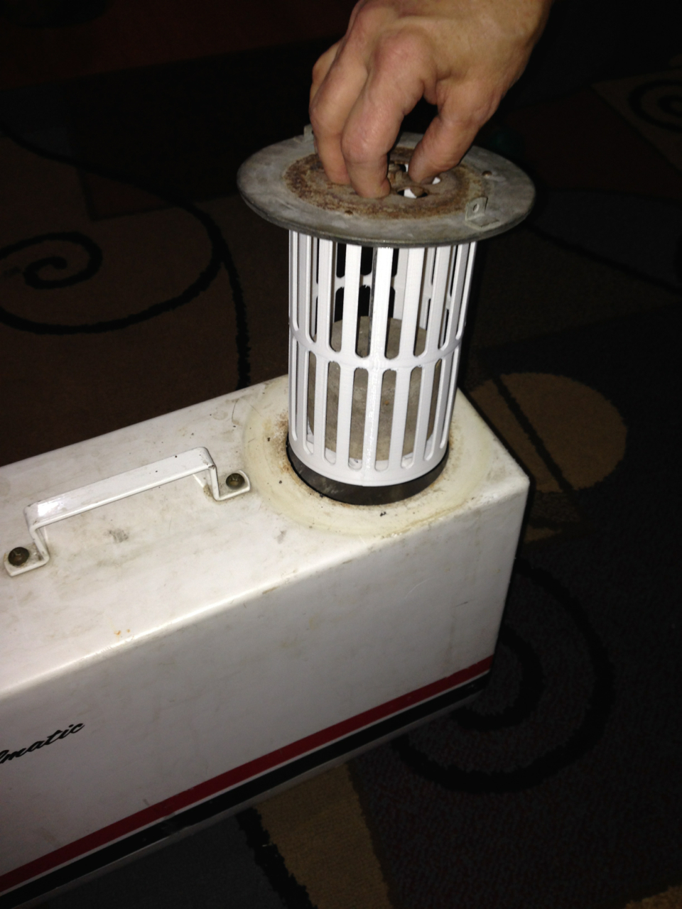 Last one for now- it is a replacement part for an older floor machine. The cage that held a float to prevent water from getting into the motor if the tank got too full had rusted the bottom out, I first printed it in PLA because I had no idea how ABS would print for my design, then later decided I would never know if I didn't try!... of course my motor mount did give it up on the first attempt, but about an hour after that discovery, I was up and printing again, and the ABS turned out great!
