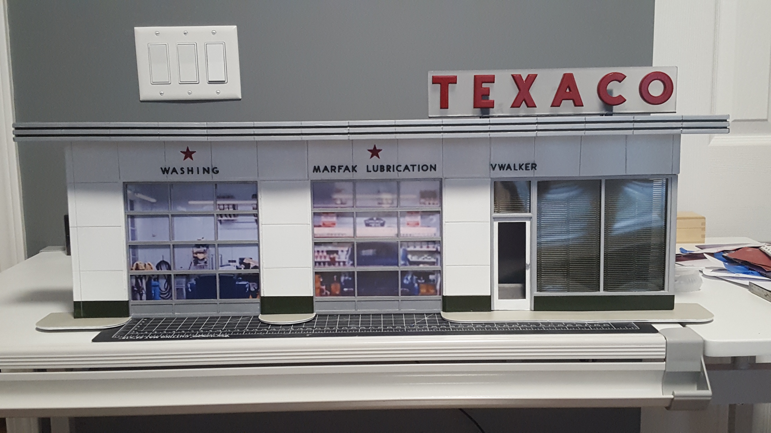 .I got interested in 3D printing to create diorama pieces for my 1/18 diecast car collection. This model is my first attempt of a vintage Texaco Gas Station for my American 60's-70's era shelf. I duplicated an existing restored Texaco Station located in Arkansas by looking at 5 photograghs of it, I've never actually seen it in person. I've included one of the photographs of it for reference. I've worked the last 30 years as an Automotive Design Engineer with as many years experience using various CAD SYSTEMS. That said I made all my own models from scratch developing the scale first by printing one of the photographs and measuring the height of the door and from there developing a starting point for the scale factor. Then I put the ABS 3D printed door next to my diecast models and figures for a couple days to see if it seemed correct. The final model is comprised of nearly 50 separate printed pieces. The only pieces that weren't 3D printed are the roof which is a sheet of ABS, the sign back is a sheet of clear acrylic, and the windows are ploystrene sheets. Finally I assembled it primarily with acetone fusing since ABS filiment was used exclusively. There were certain instances where I needed model glue and clear window cement, everything was painted with conventional enamel modeling paint. In the future I plan on expanding on the diorama by adding the phone booth and a better pump island. Then maybe I'll start developing some of the inventions that have been floating around in my head for the last several years. Thanks for looking.
