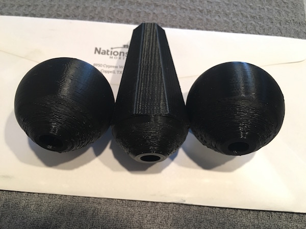 First attempt I printed the file that prints all the parts at once. Three spheres and six other pieces that have a sphere shaped base. Bottom halves of the sphere shapes printed like this..