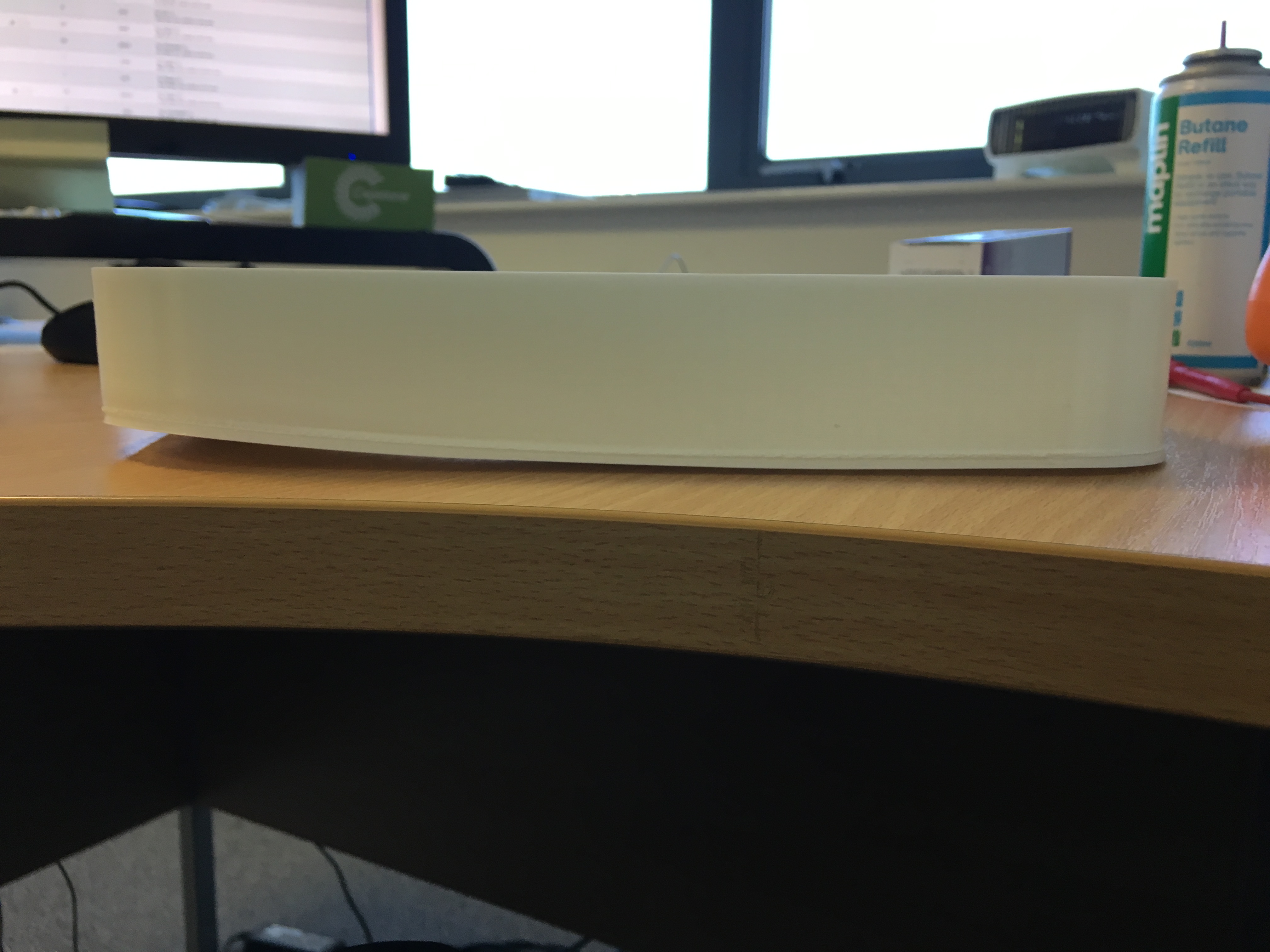 I printed an object that fills the entire print bed, and while the first few layers went down well, I woke up this morning to find the print had warped at the corners quite significantly. I was quite surprised to see this as the corners have a fairly large radius and the first layer was squished well. This was printed on top of a MIC6 and PEI sheet that has been lightly sanded. Print temp is 213 and bed temp is 50, 2 outer layers and 4 bottom layers. Here's a few pics: