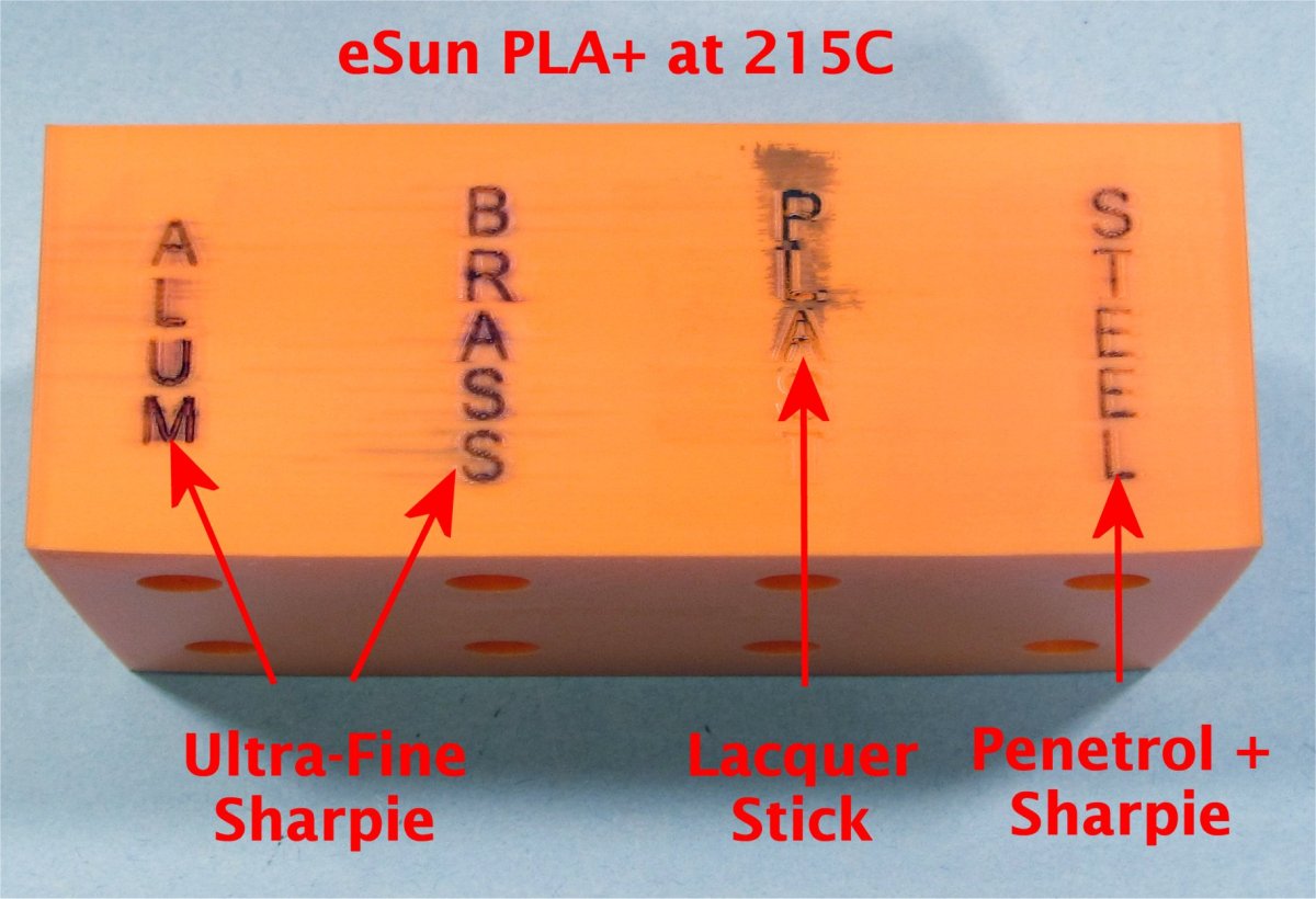 I'm using eSun PLA "Plus" to make a block to hold some deburring tools in my shop. I printed the first attempt at 215C, and as I expected, if you try to fill in the letters with an Ultra-Fine Point Sharpie, two things happen: 1) the tip is too wide to get down into the bottom of a lot of the letters, and 2) the ink tends to wick into the passages left where the filament didn't fuse completely. It's hard to keep the Sharpie in the grooves, and if it bounces out, you have a mark that you have to clean up with alcohol. That thins out the ink even further, and it REALLY wicks into the print, leaving lots of fine black lines embedded in the plastic.